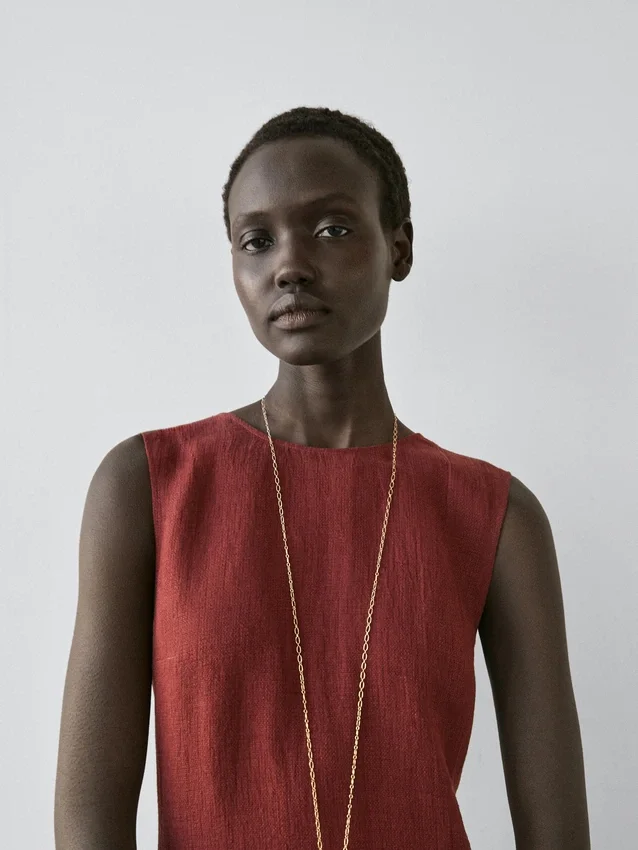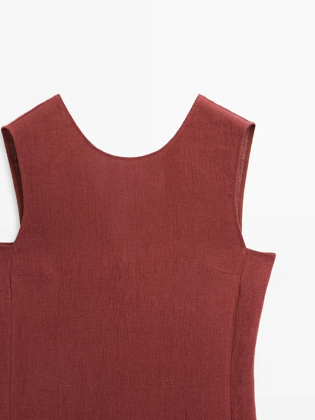 Abiti realizzati in tessuto 100% lino. Girocollo. Scollo a V sul retro. Senza maniche. Chiusura con cerniera sul retro.