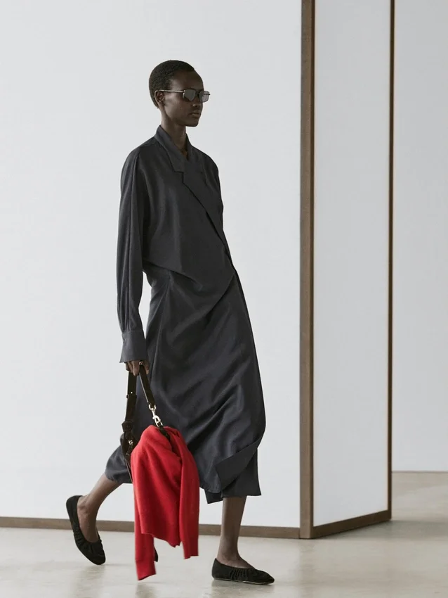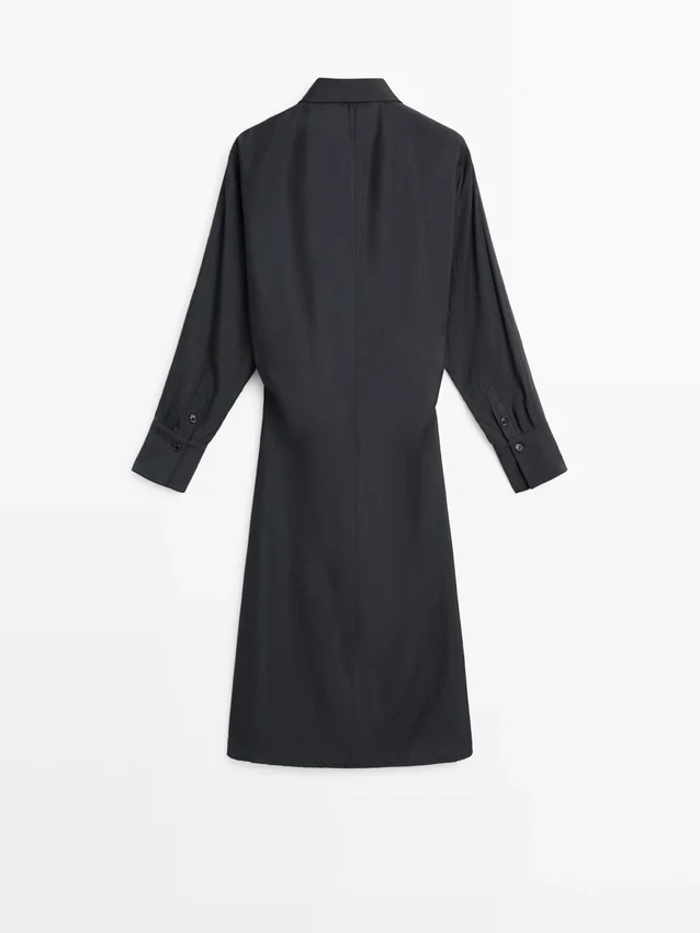 Abito di lunghezza media. Colletto con revers a V. Dettagli drappeggiati. Maniche lunghe con bottoni. Chiusura con bottoni sul lato.