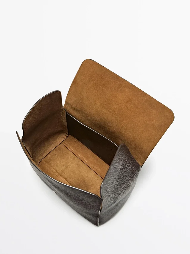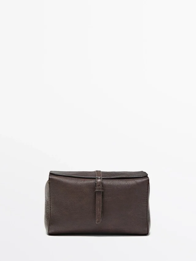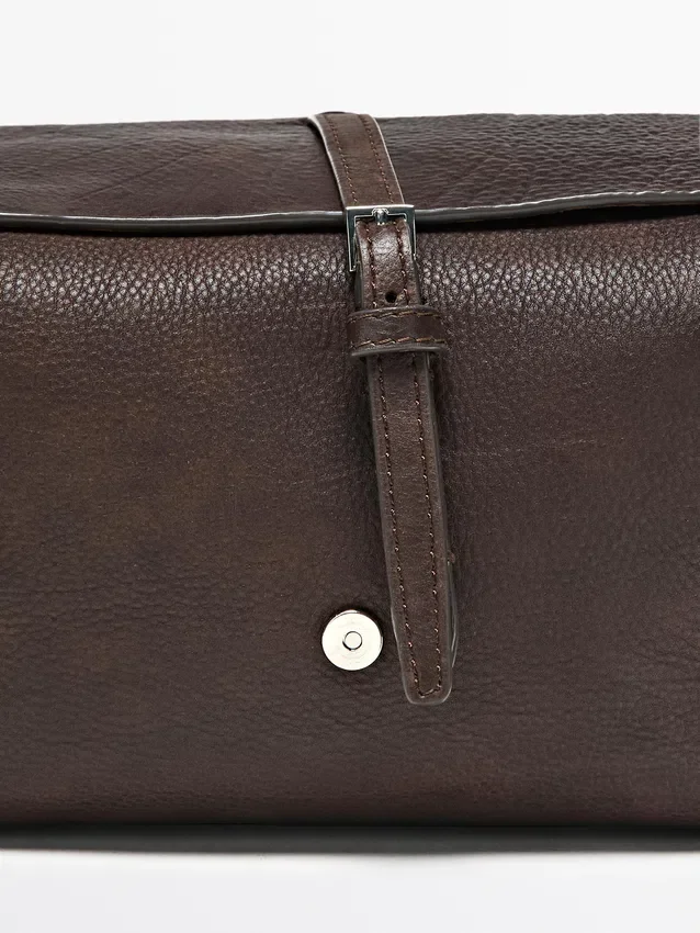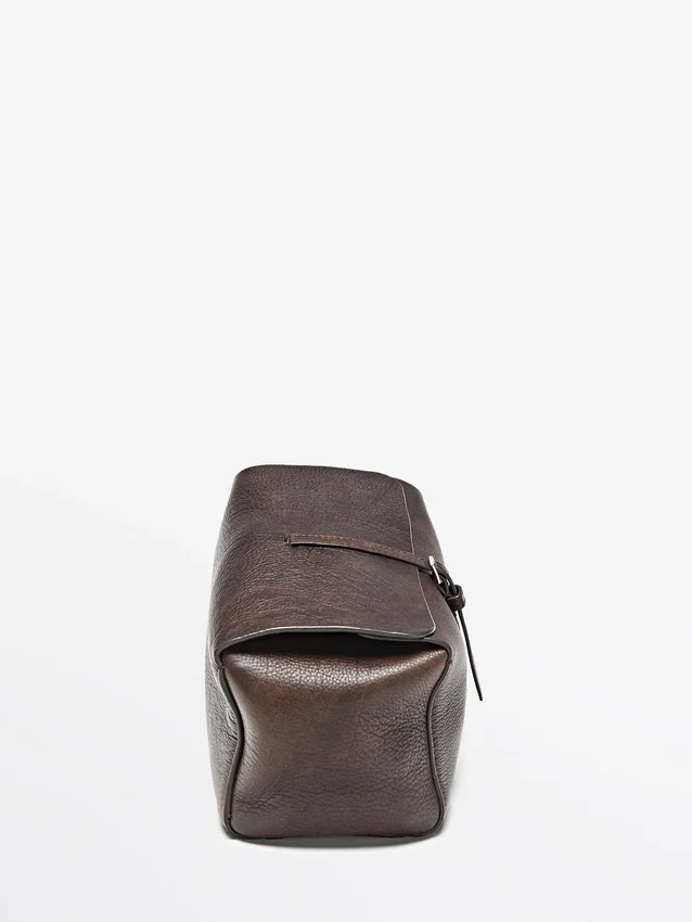 Borsa da viaggio in pelle di vacchetta con finitura in pelle nappa. Chiusura con linguetta a bottone a pressione magnetico.
