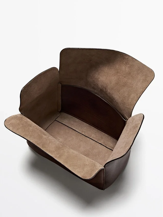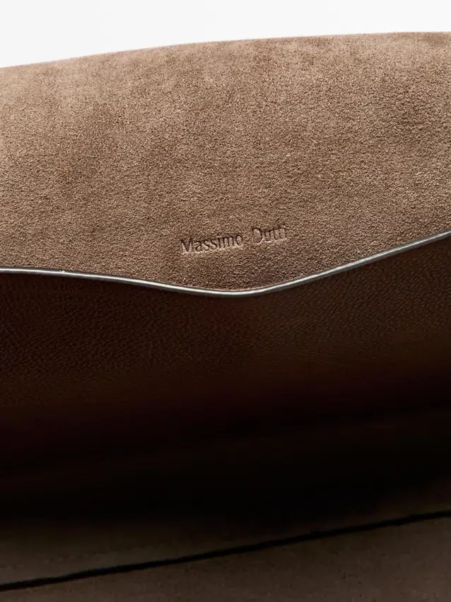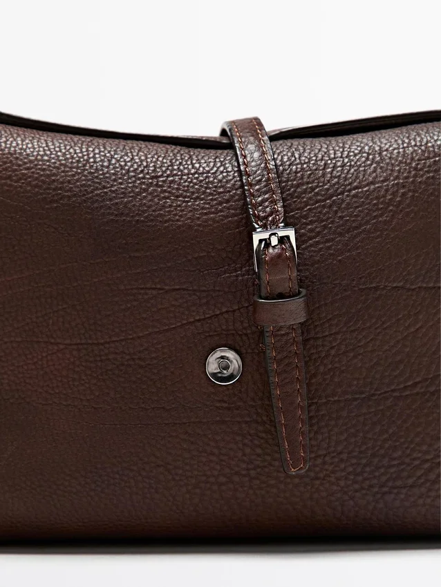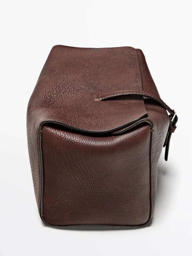 Borsa da viaggio in pelle di vacchetta con finitura in pelle nappa. Chiusura con fibbia in metallo e passante in pelle per cintura.