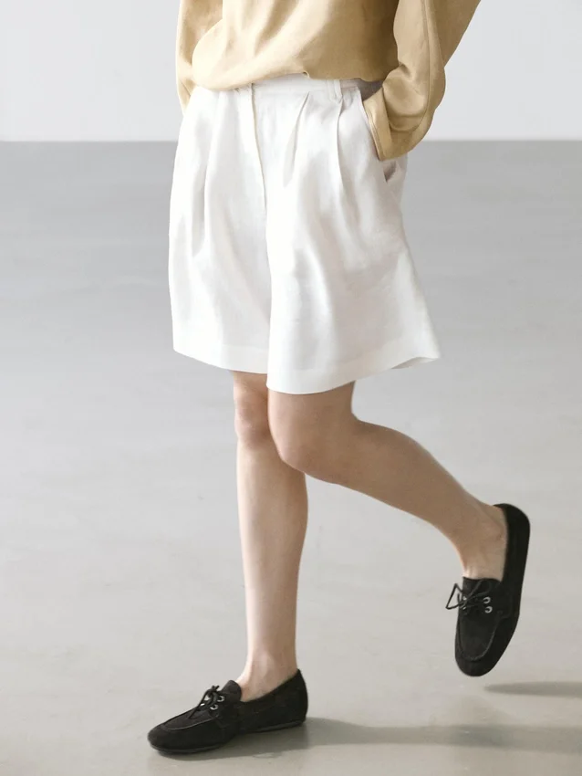 Bermuda realizzati in tessuto fluido. Chiusura con cerniera e ganci con bottone interno. Due tasche laterali.