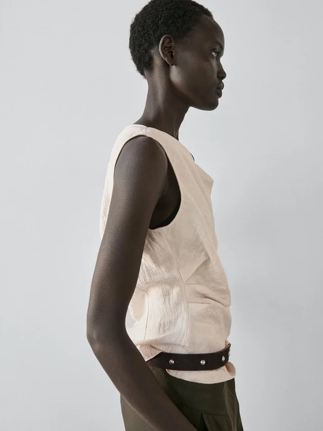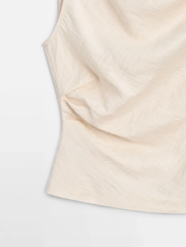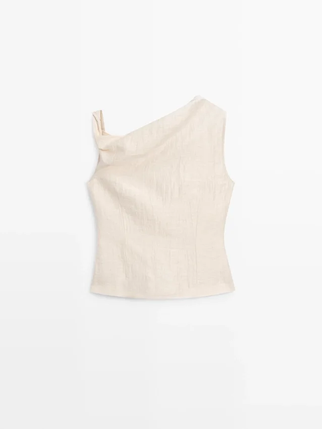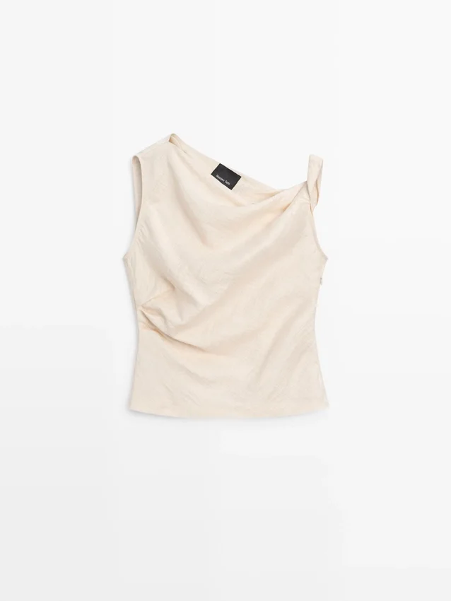 Top asimmetrico con dettagli drappeggiati. Senza maniche. Dettaglio nodo. Capo abbinato disponibile.