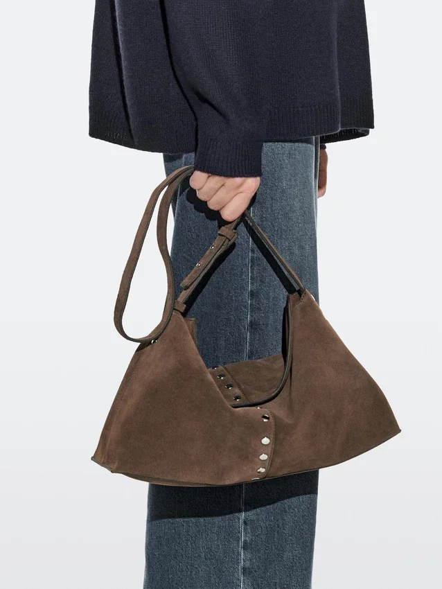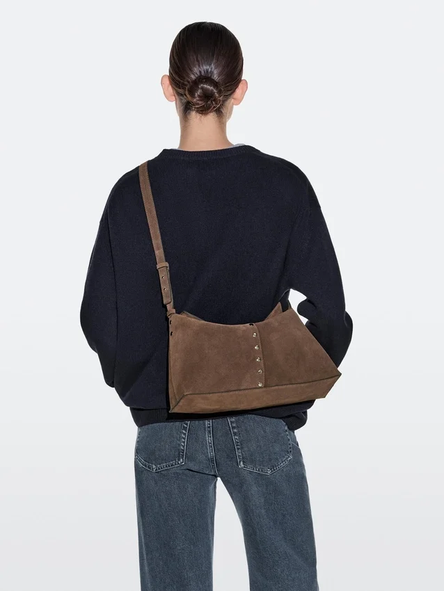 Borsa realizzata in pelle bovina con finitura in pelle crosta. Tracolla regolabile. Chiusura con bottone a scatto magnetico. Una tasca interna. Fodera in cotone. Dettagli con borchie in metallo.