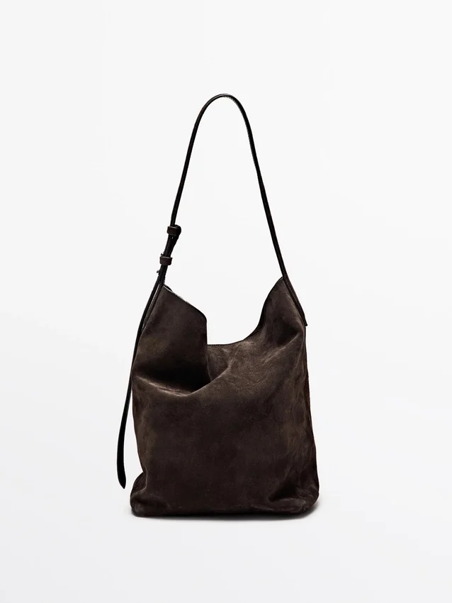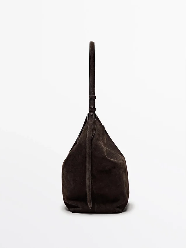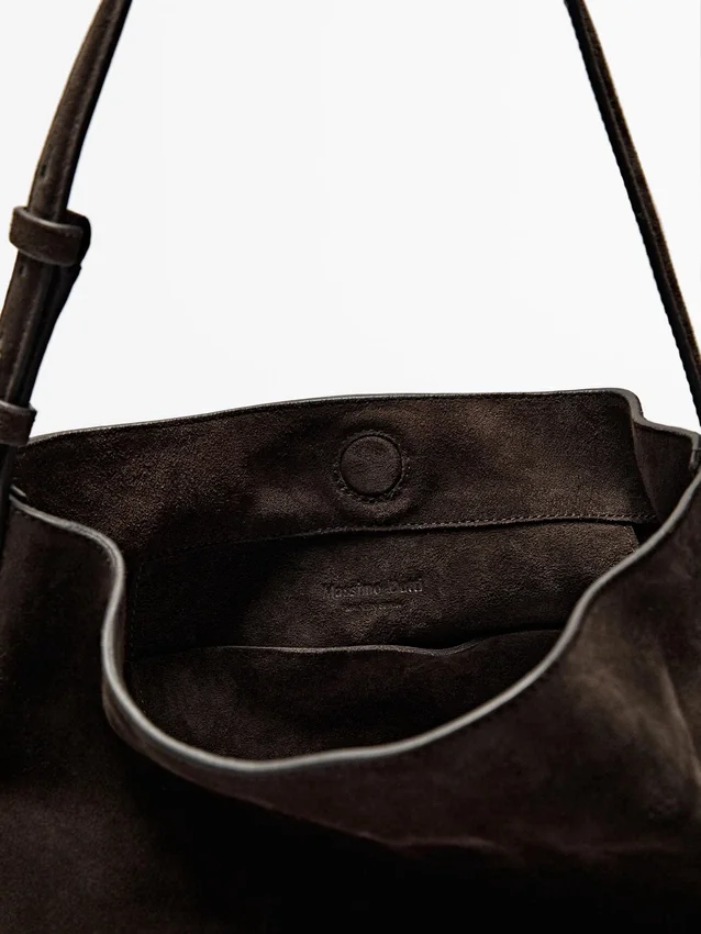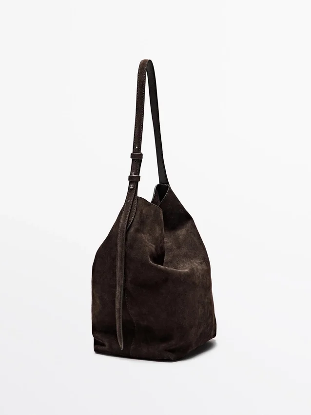 Borsa a secchiello. Borsa a mano realizzata in pelle bovina con finitura in pelle crosta. Tracolla regolabile. Patta con chiusura magnetica nascosta. Una tasca interna. Scomparto principale.