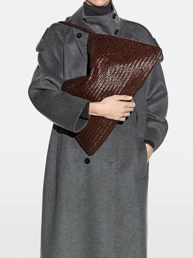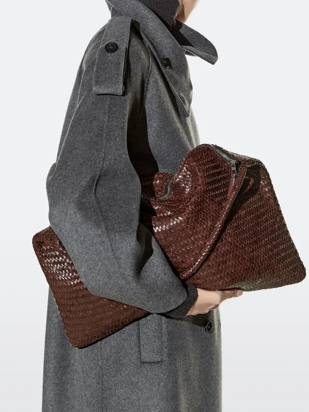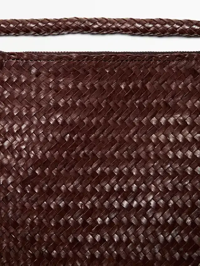 Borsa a mano realizzata in pelle di vacchetta con finitura nappa. Un manico/tracolla. Chiusura con cerniera. Fodera in cotone. Dettagli intrecciati.
