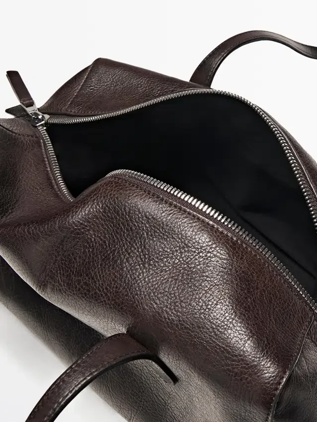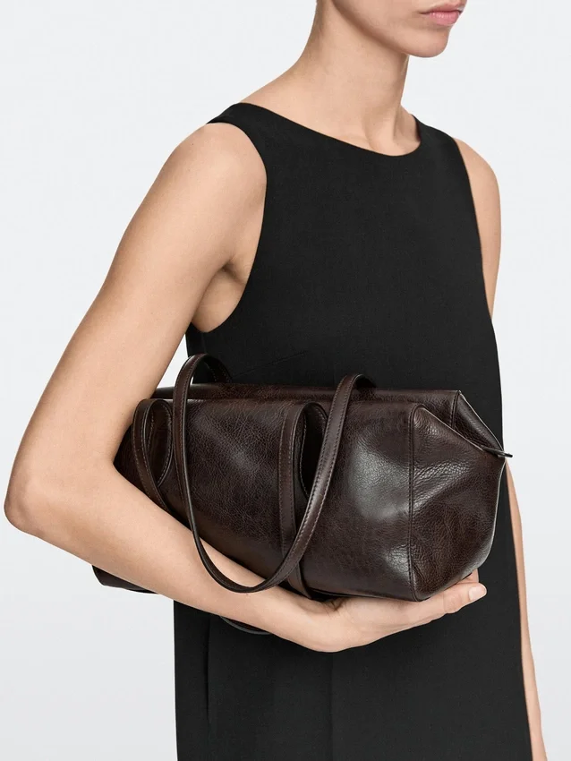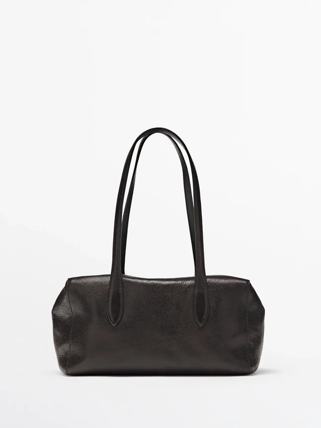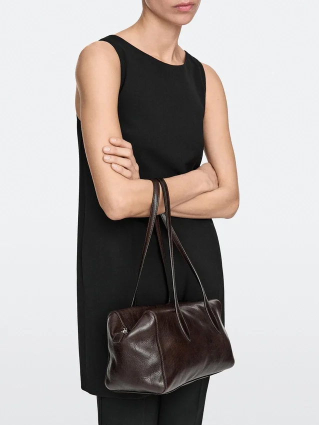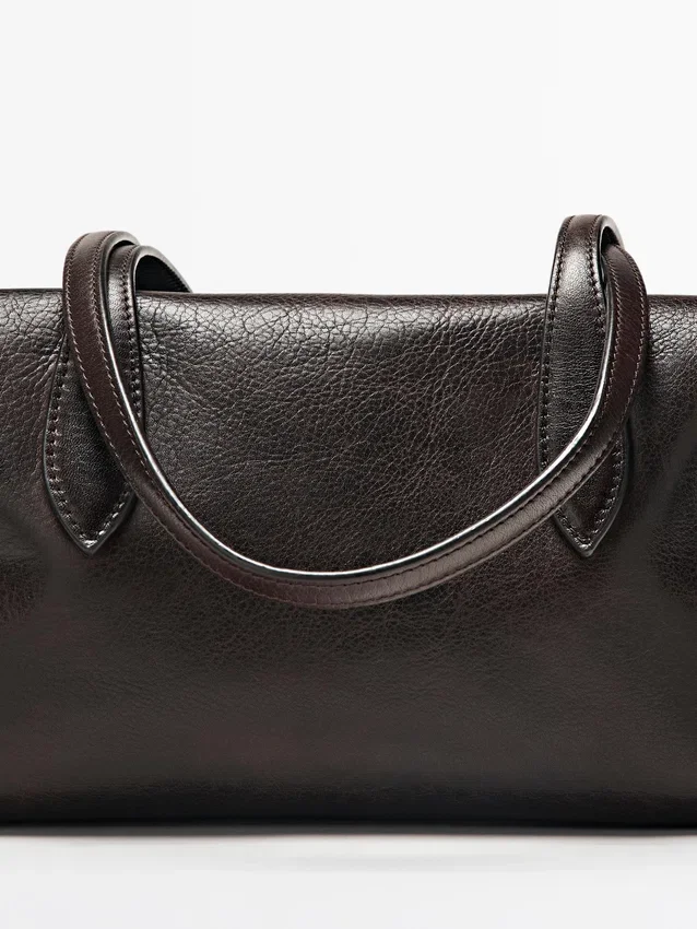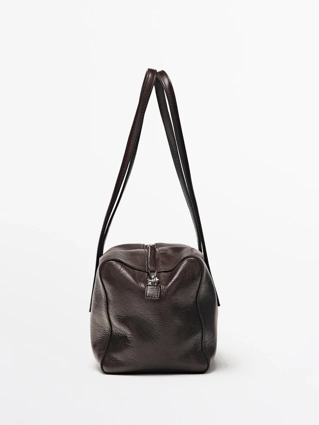 Borsa a mano in pelle di vacchetta con finitura nappa. Chiusura con cerniera. Due manici e tracolla. Fodera in cotone.