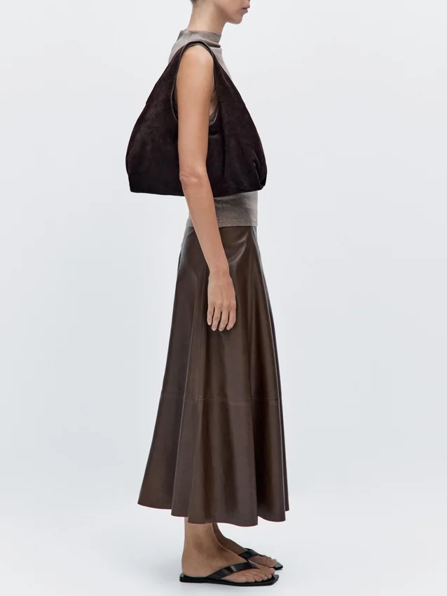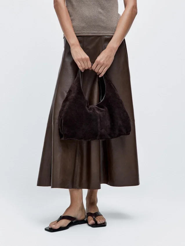 Borsa realizzata in pelle bovina con finitura in pelle crosta. Un manico/tracolla. Chiusura con bottone a scatto magnetico. Una tasca interna. Fodera in cotone.