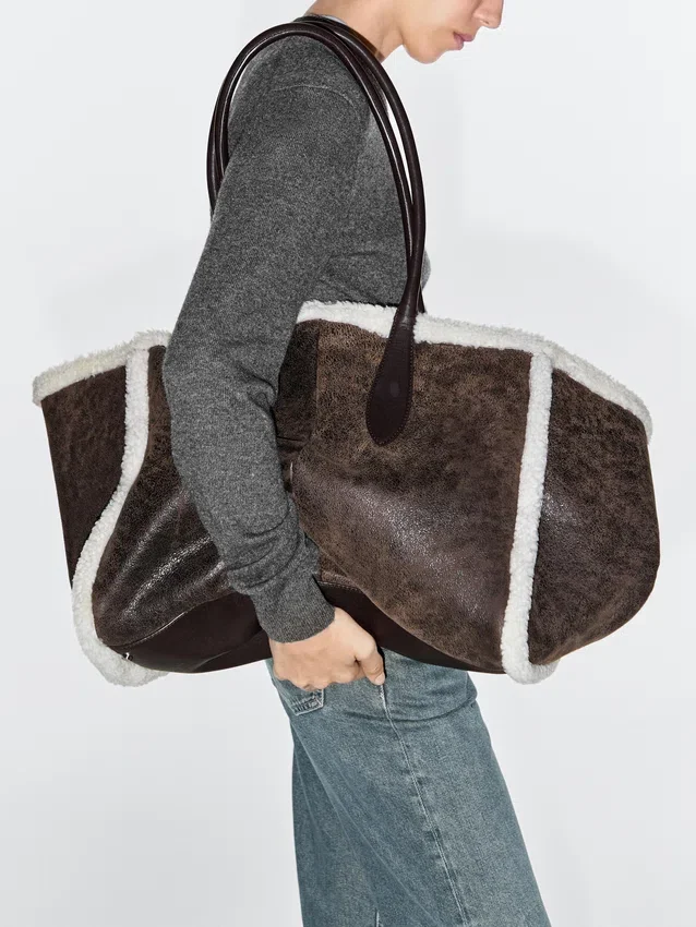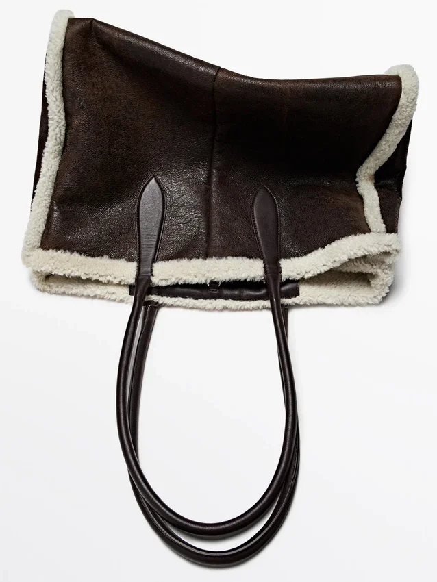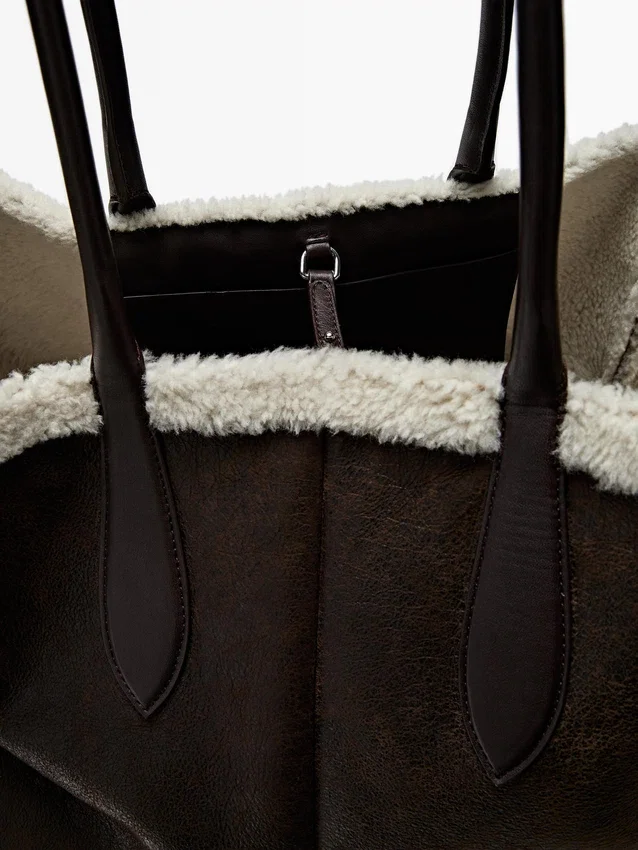 Borsa maxi in pelle di vacchetta con pelliccia. Chiusura interna con fibbia. Due manici e/o tracolla.