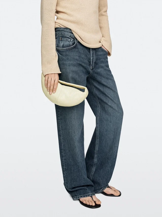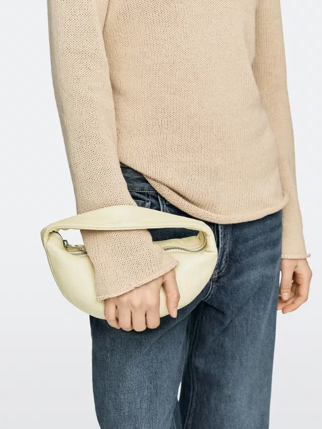 Borsa a mezzaluna in pelle di vacchetta. Chiusura con cerniera. Cinturino da polso. Foderata. Dettagli in pelle craquelé.Composizione