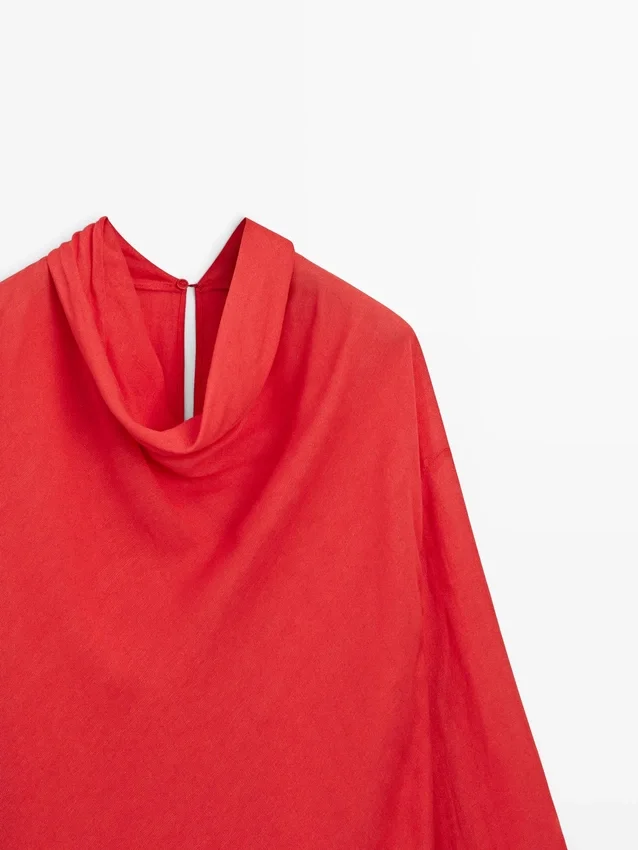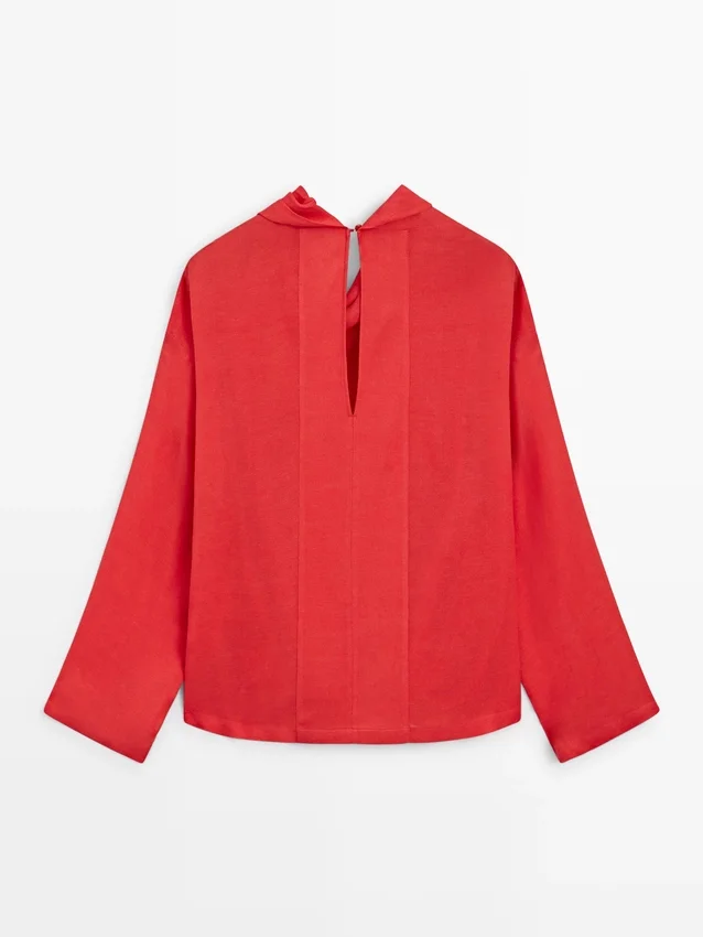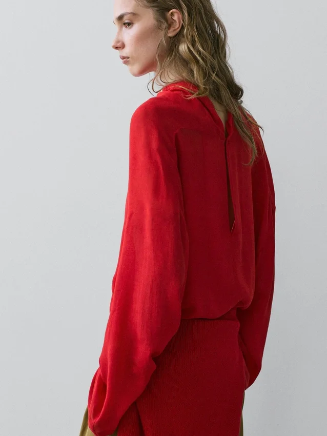 Camicetta fluida. Collo drappeggiato. Maniche lunghe. Chiusura con bottoni sul retro e apertura a goccia.