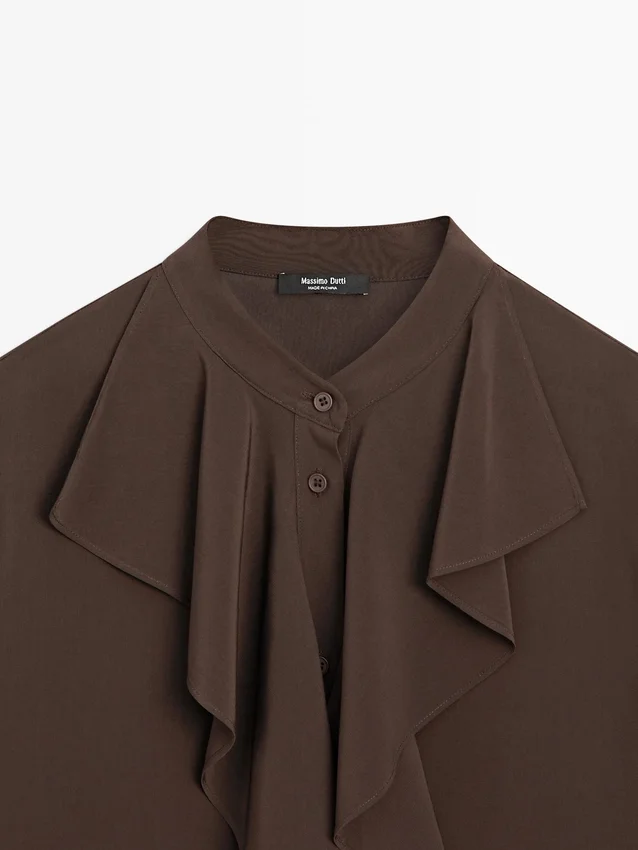 Camicetta fluida con maniche lunghe. Colletto alla coreana. Chiusura frontale con bottoni. Dettagli a balze.