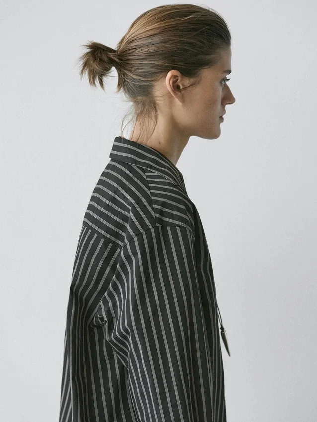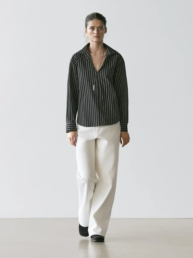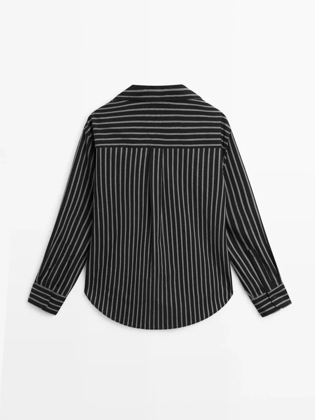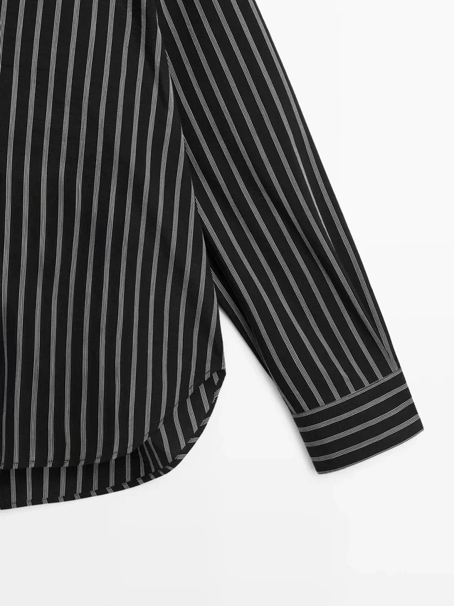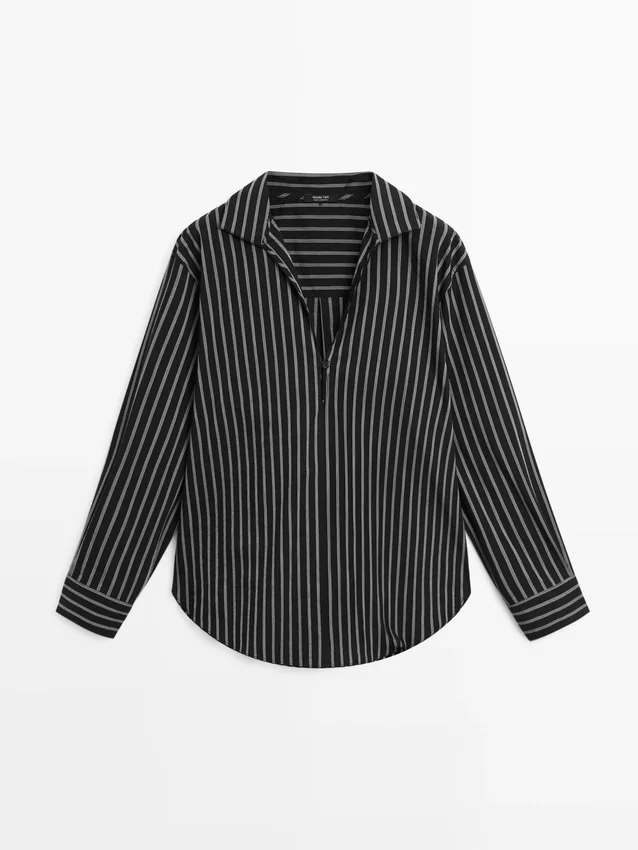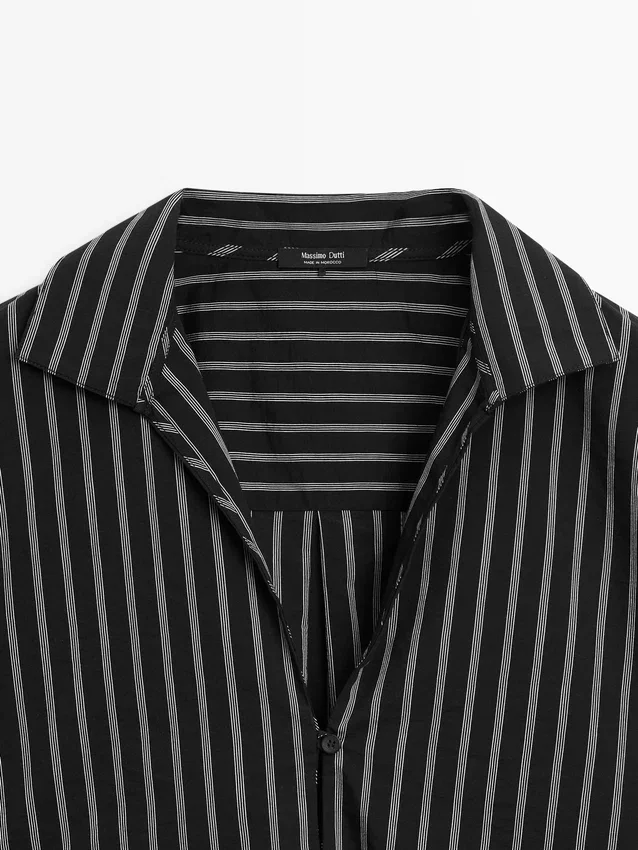 Camicia in tessuto misto cotone. Maniche lunghe con polsini abbottonati. Colletto aperto. Stampa a righe.