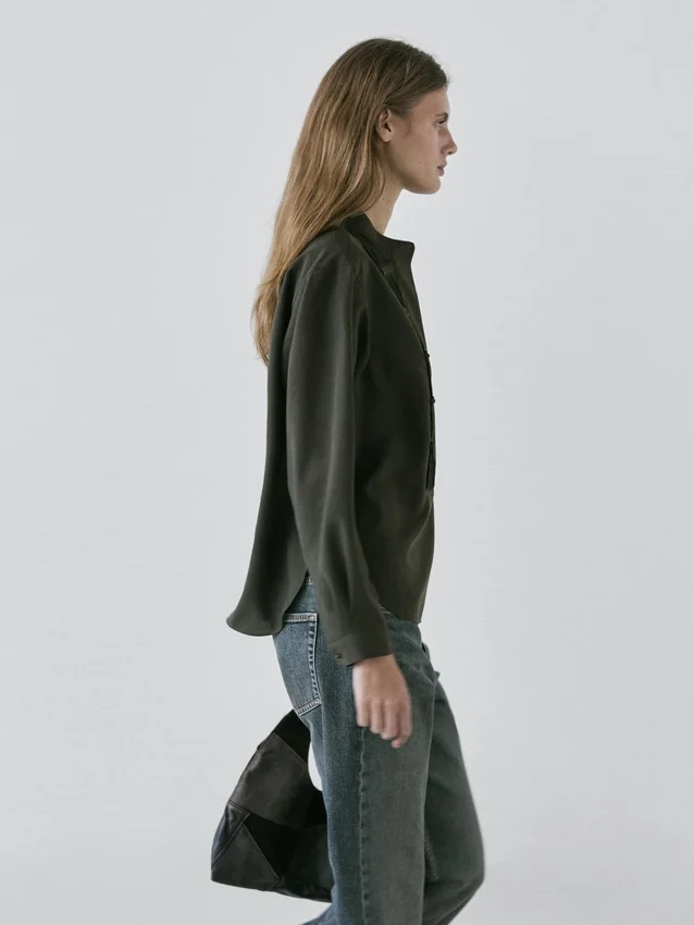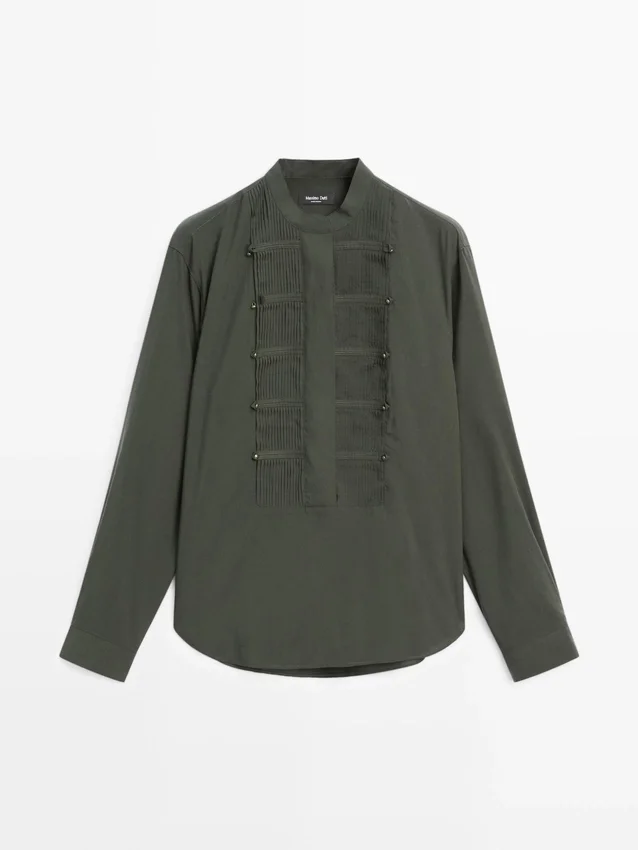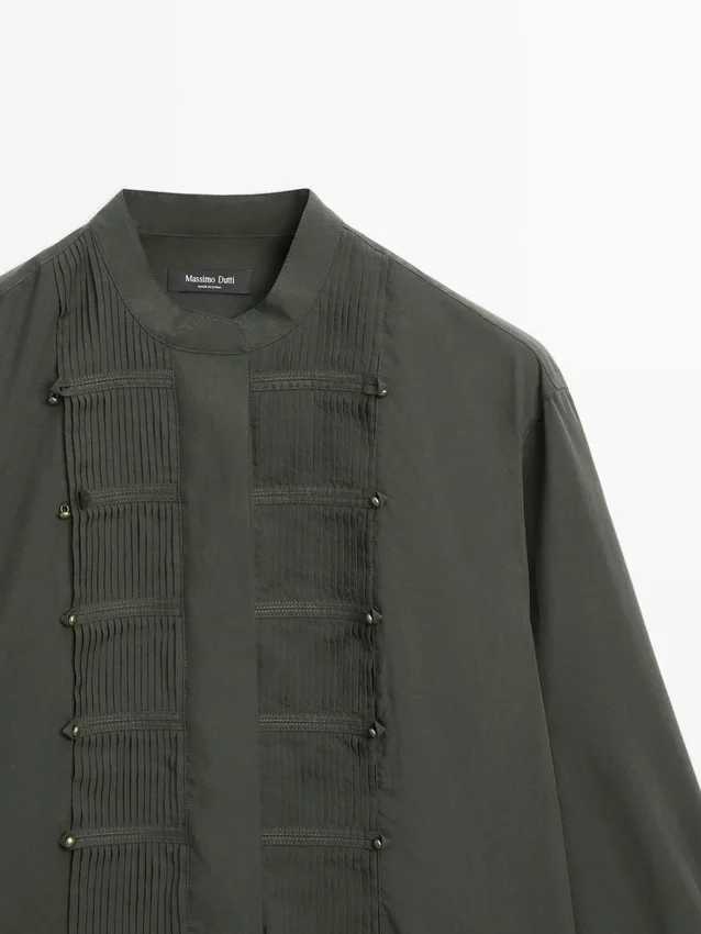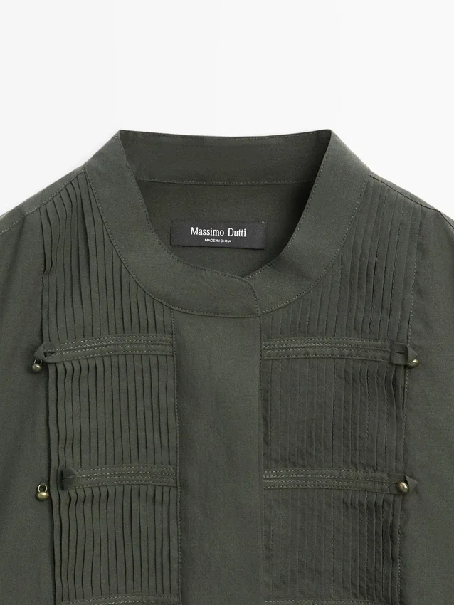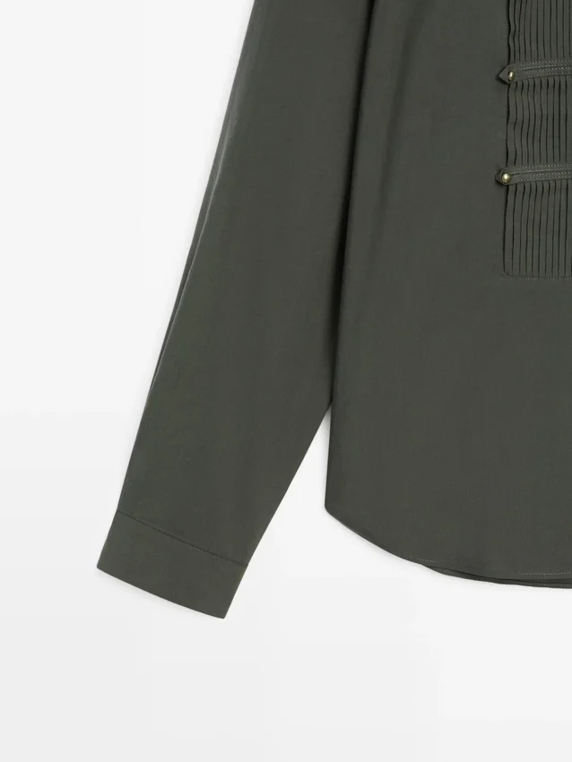 Camicia a maniche lunghe. Colletto alla coreana. Chiusura frontale con bottoni nascosta da un’abbottonatura. Dettagli a pieghe. Dettagli sul petto.