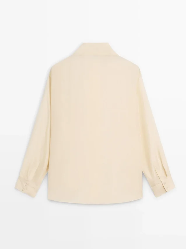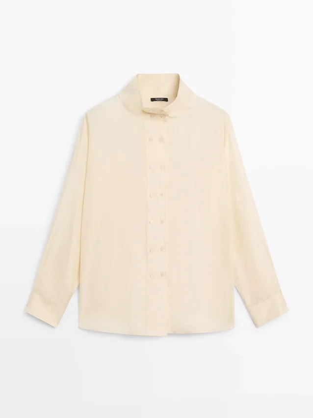 Camicia realizzata in tessuto di seta al 100%. Maniche lunghe con polsini abbottonati. Chiusura a doppio petto con bottoni. Collo alto.
