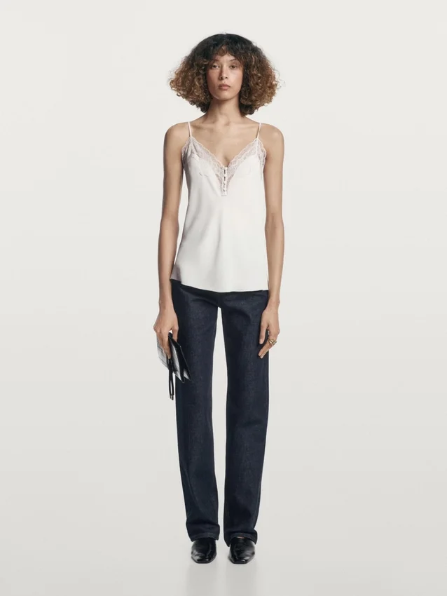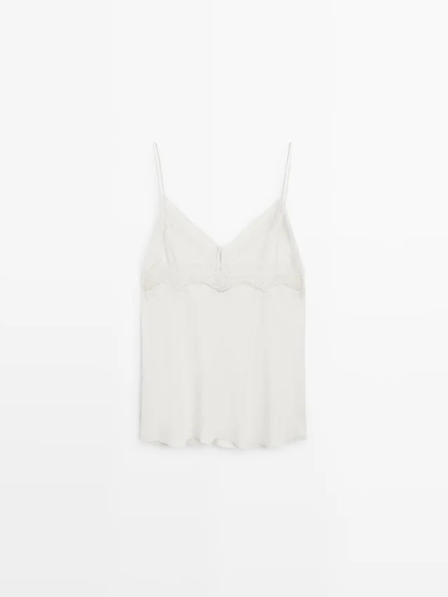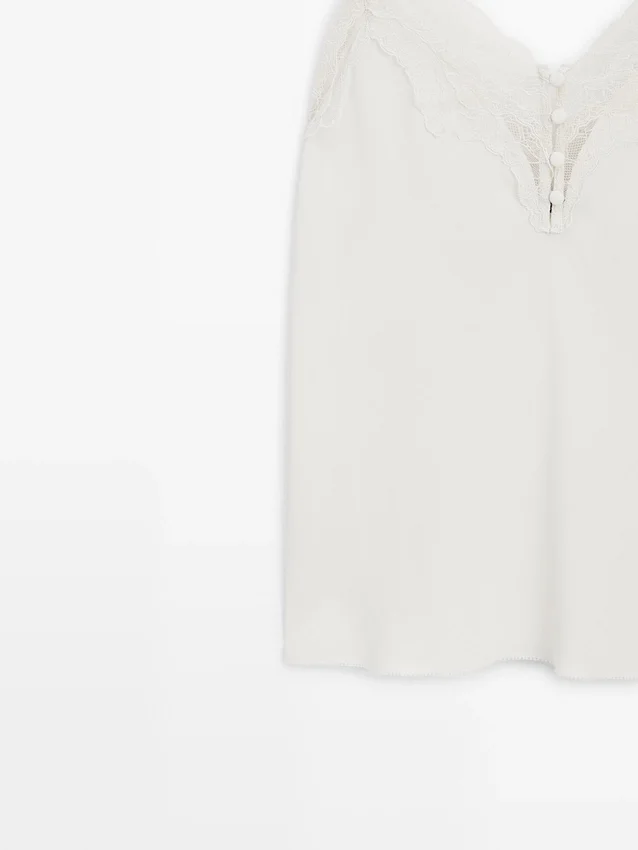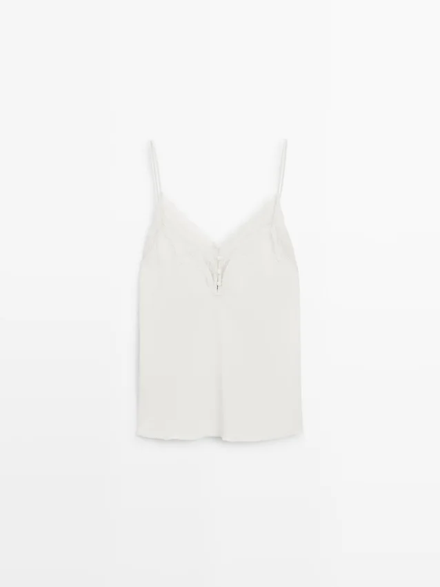 Top a canotta. Spalline. Dettagli in pizzo. Dettagli con bottoni ricoperti.