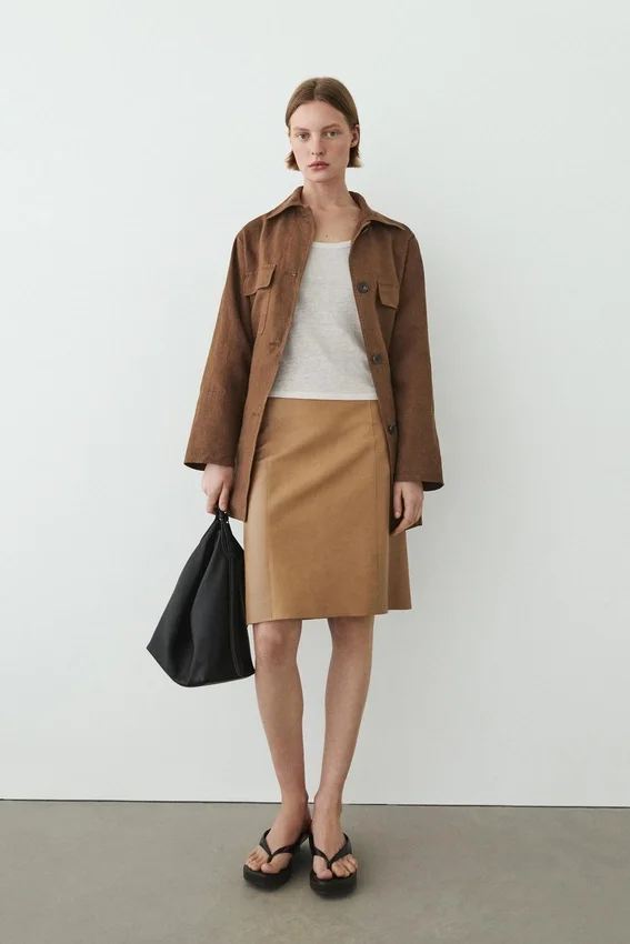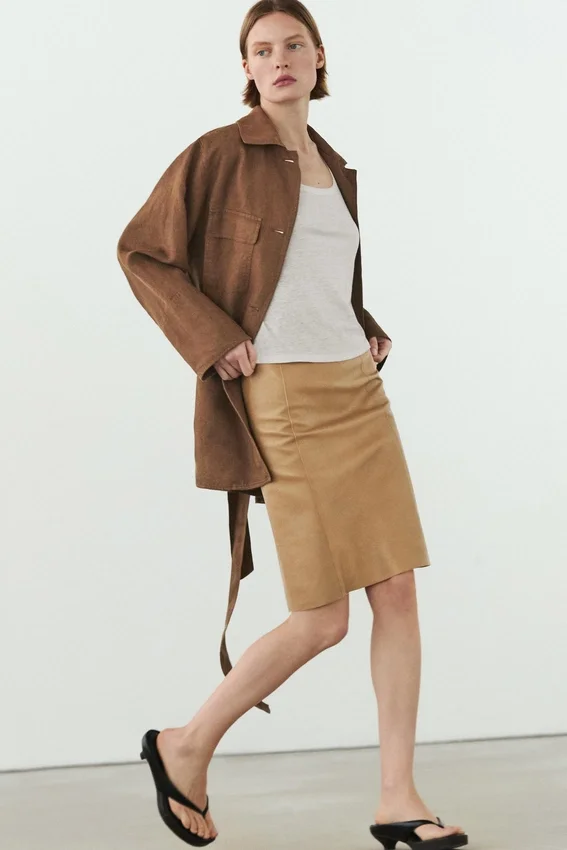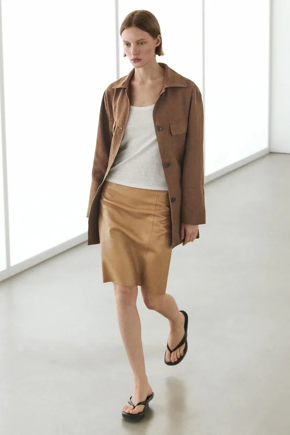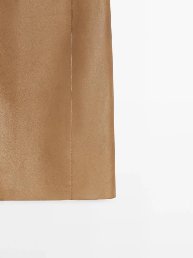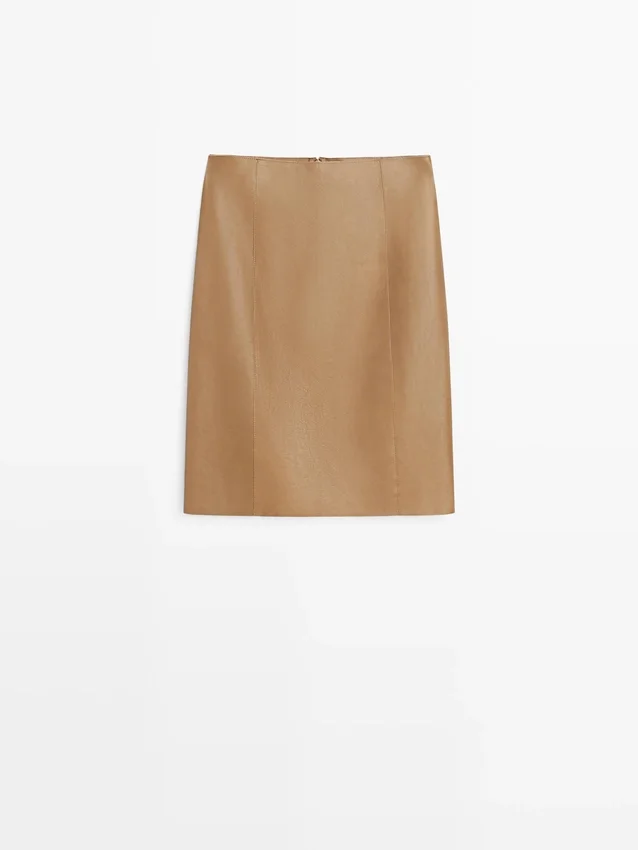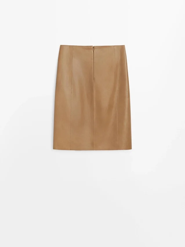 Gonna in pelle di pecora con finitura in pelle nappa. Chiusura con cerniera sul retro. Foderata.