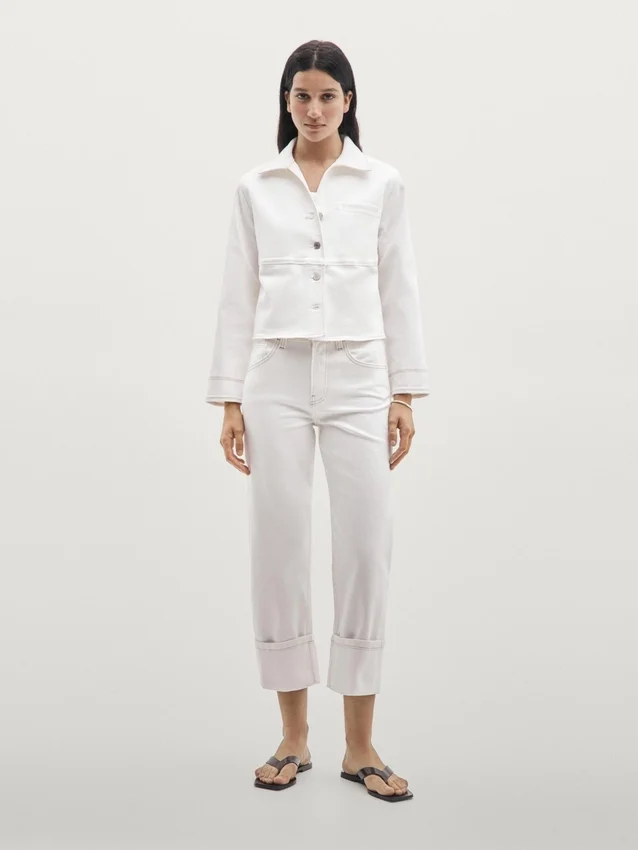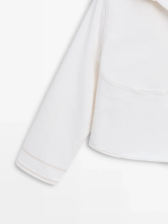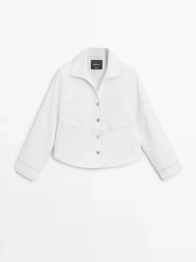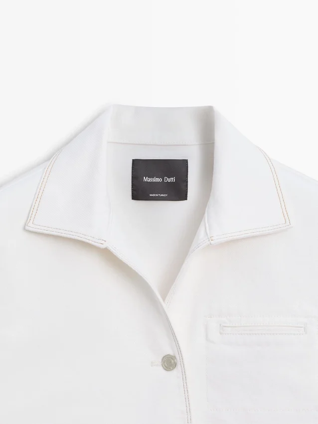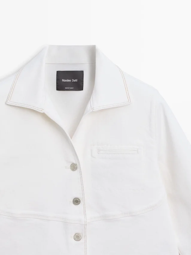 Giacca in denim. Colletto a camicia. Maniche lunghe. Chiusura frontale con bottoni. Tasca a filetto sul petto. Dettagli in colore a contrasto.