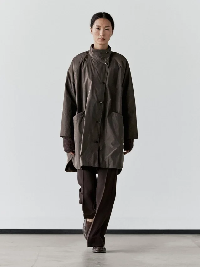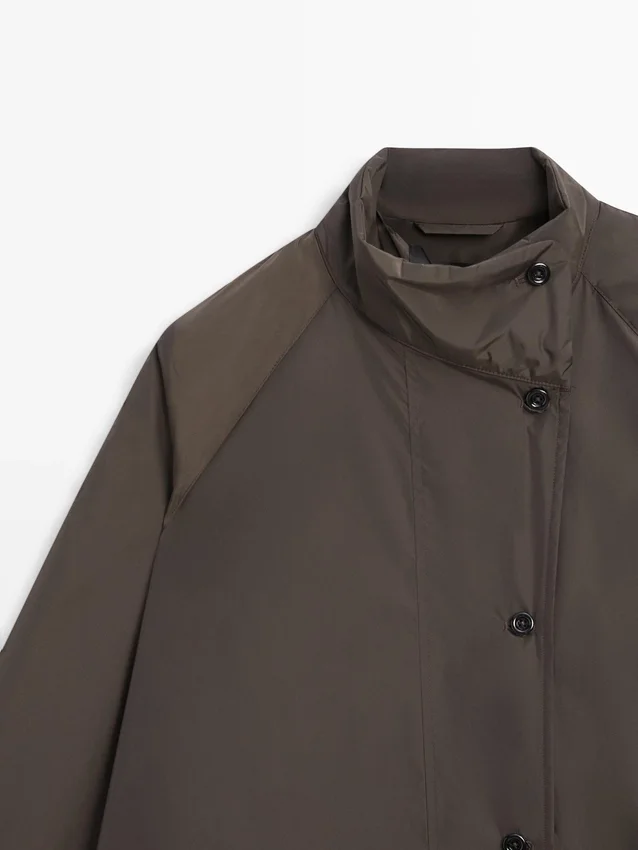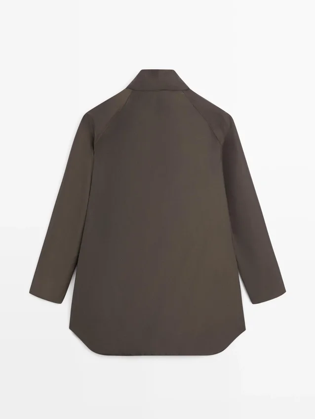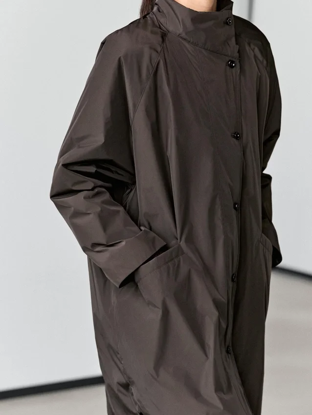 Piumino lungo. Collo alto abbottonato. Maniche lunghe. Chiusura frontale con bottoni. Due tasche laterali.