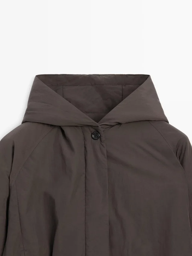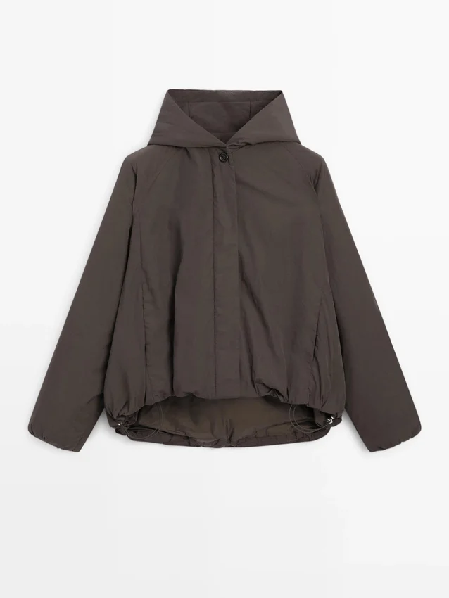Giacca bomber. Maniche raglan. Chiusura con cerniera nascosta e abbottonatura. Cappuccio. Orlo elasticizzato regolabile. Due tasche laterali. Tessuto idrorepellente.