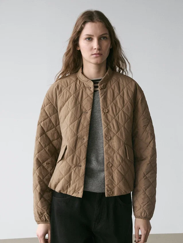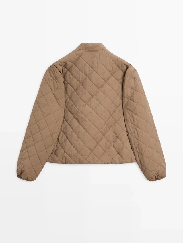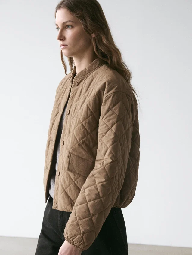 Giacca con leggera imbottitura. Collo alto. Maniche lunghe. Chiusura frontale con bottoni. Due tasche con patta.