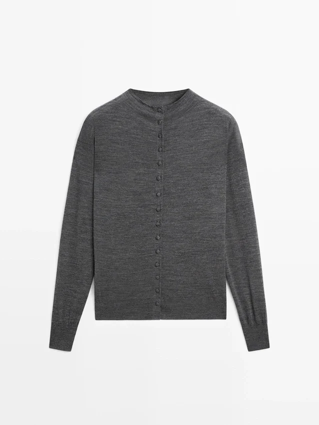 Cardigan in maglia di lana. Finto collo alto. Maniche lunghe. Chiusura frontale con bottoni. Bordi a costine.