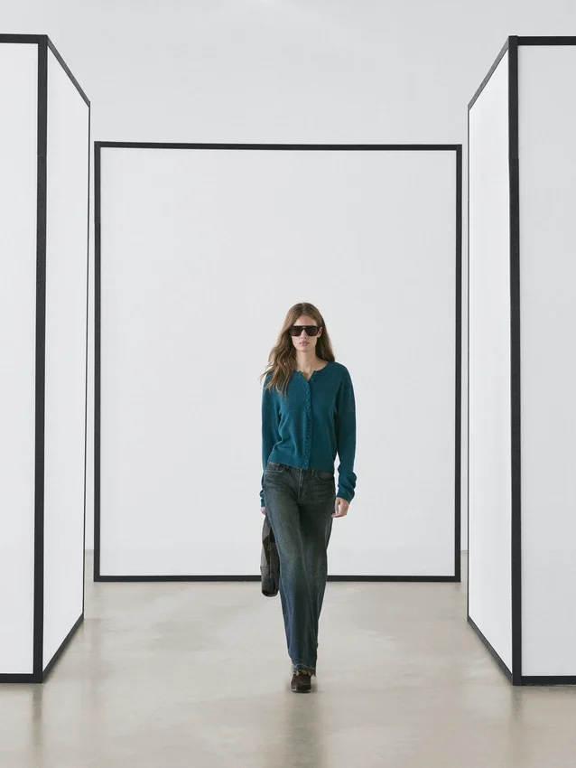 Cardigan realizzato in maglia di lana. Girocollo. Maniche lunghe. Chiusura frontale con bottoni. Dettaglio bottoni ricoperti. Tessuto a costine.