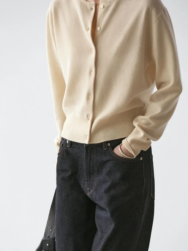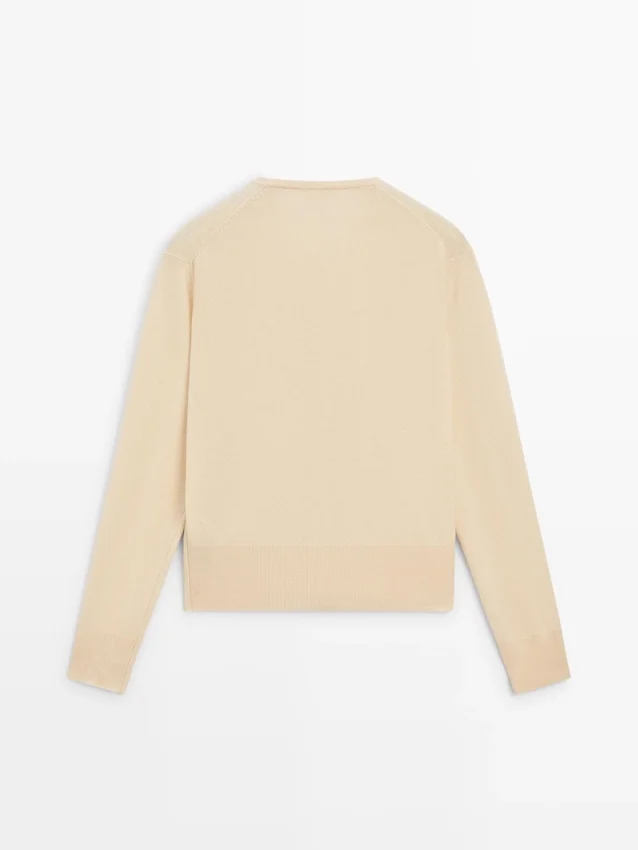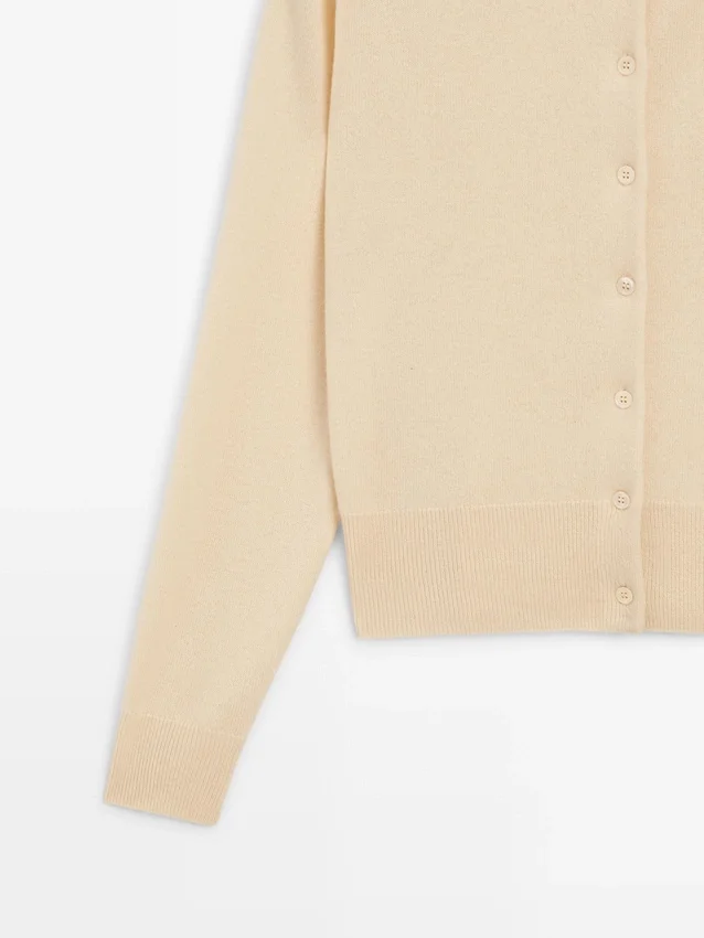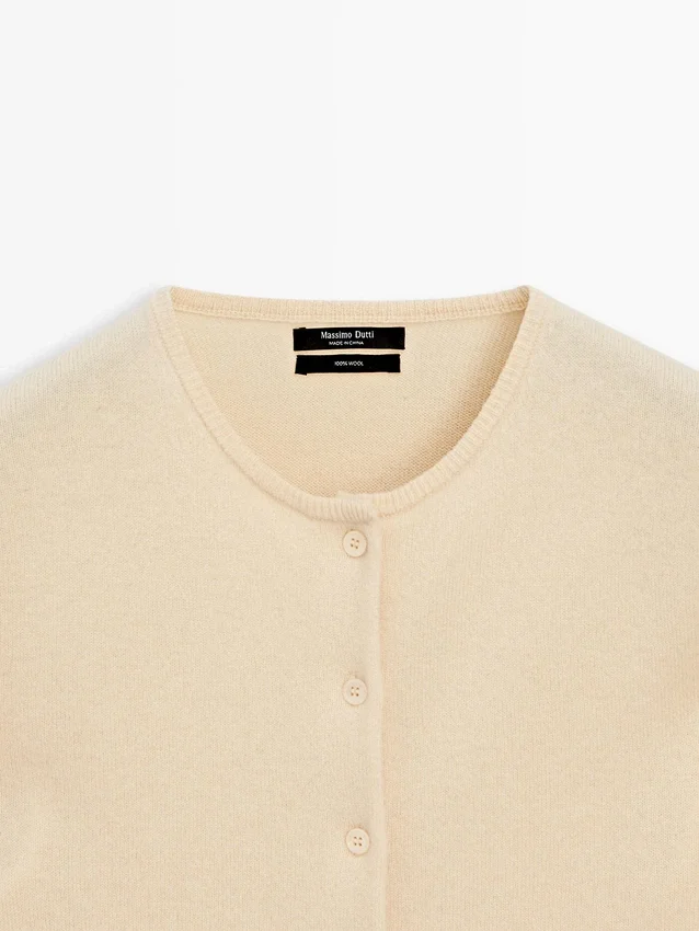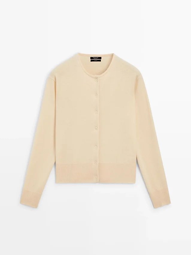 Cardigan in maglia di lana. Girocollo. Maniche lunghe. Chiusura frontale con bottoni.