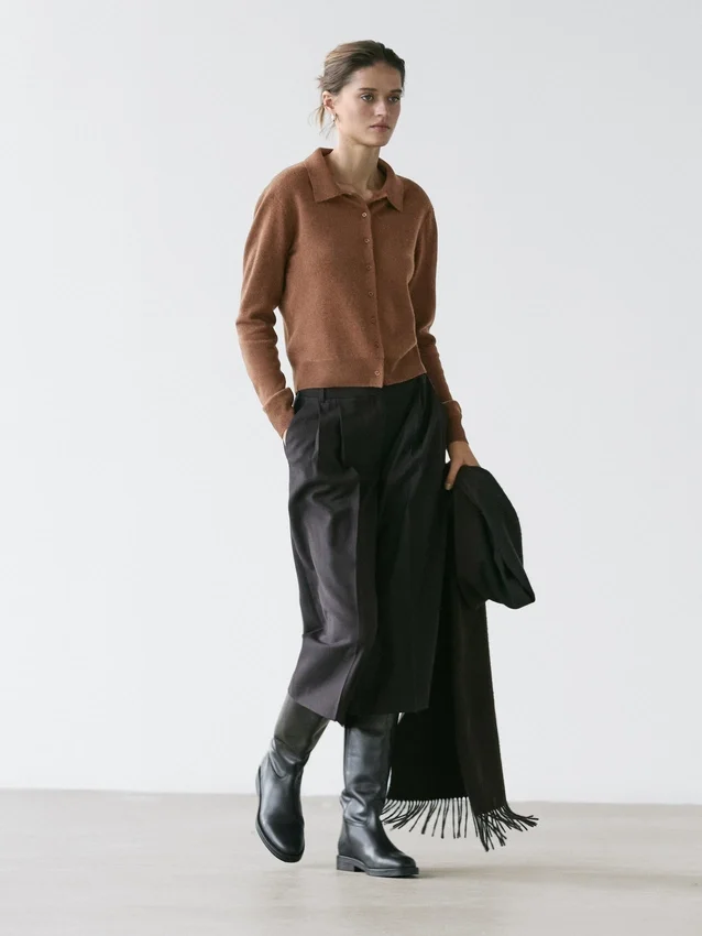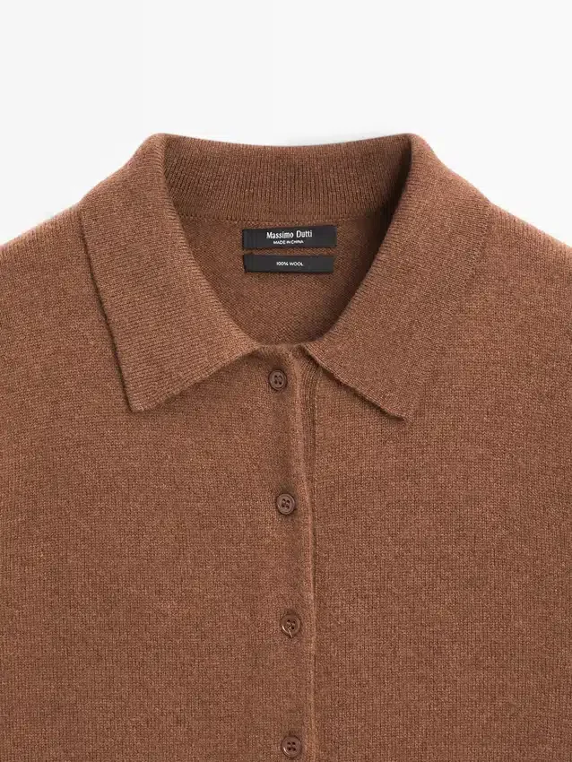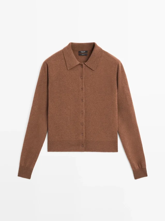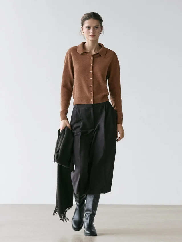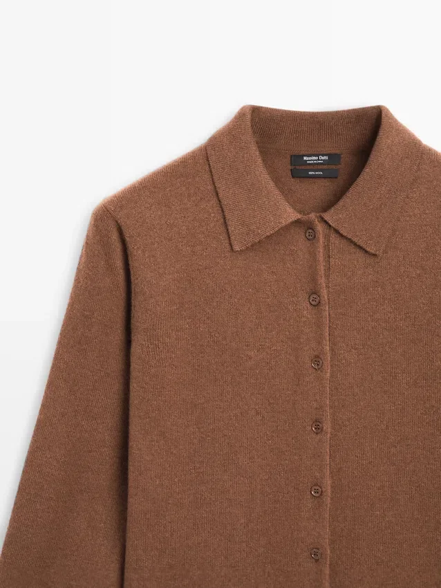 Cardigan in maglia di lana. Colletto alla camicia. Maniche lunghe. Chiusura frontale con bottoni.