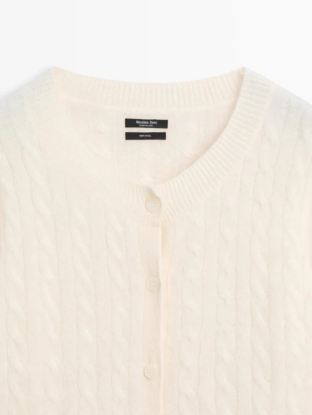 Cardigan in maglia di lana. Girocollo. Chiusura frontale con bottoni. Dettagli intrecciati.