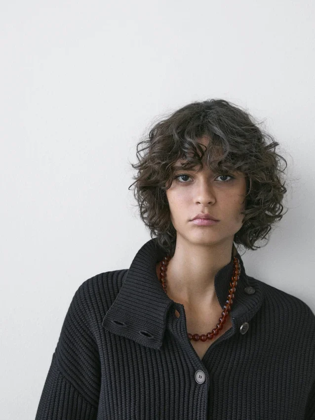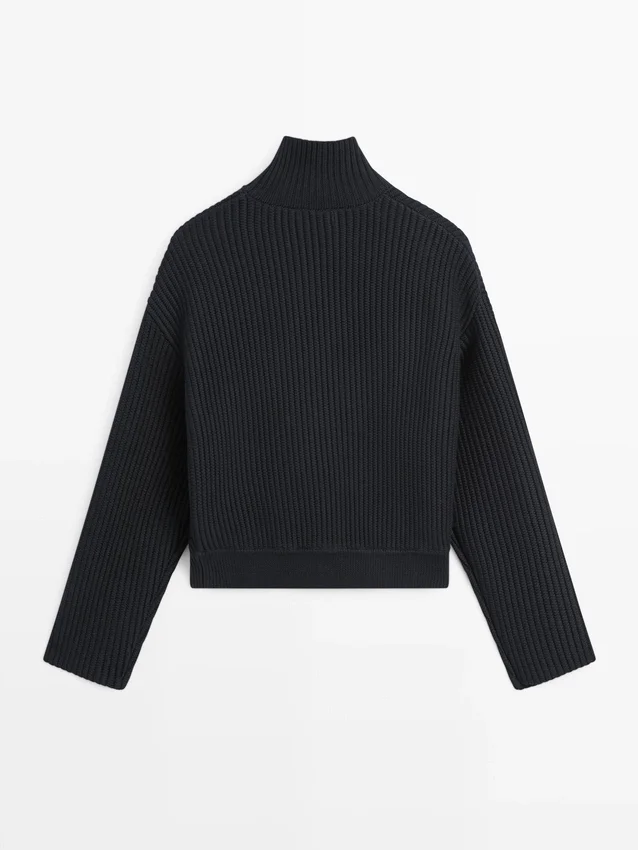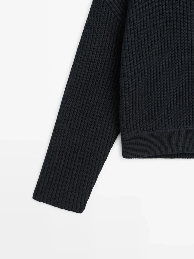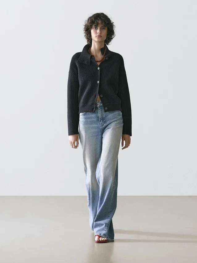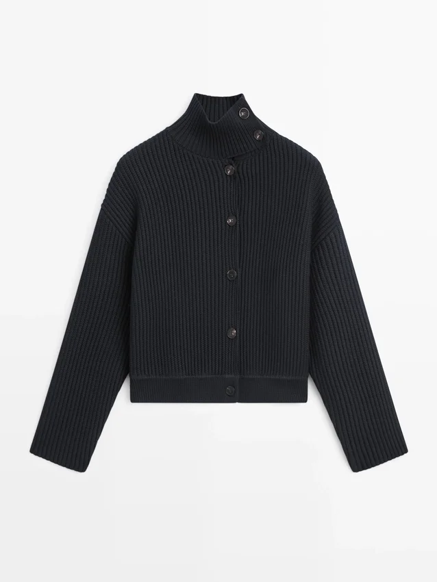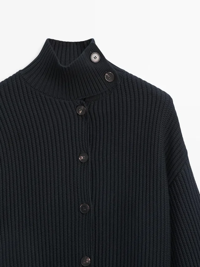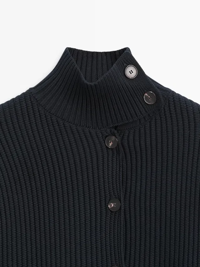 Cardigan in maglia di cotone. Collo alto abbottonato. Maniche lunghe. Chiusura frontale con bottoni. Bordi a costine.