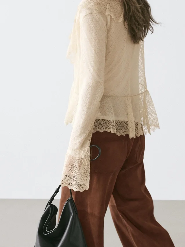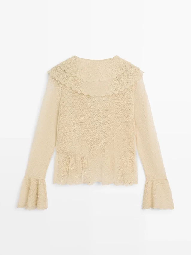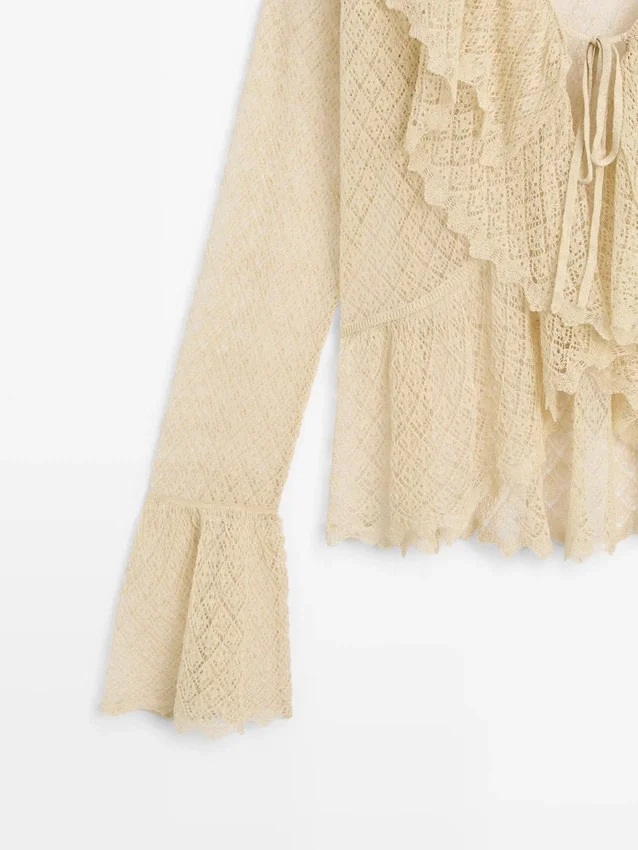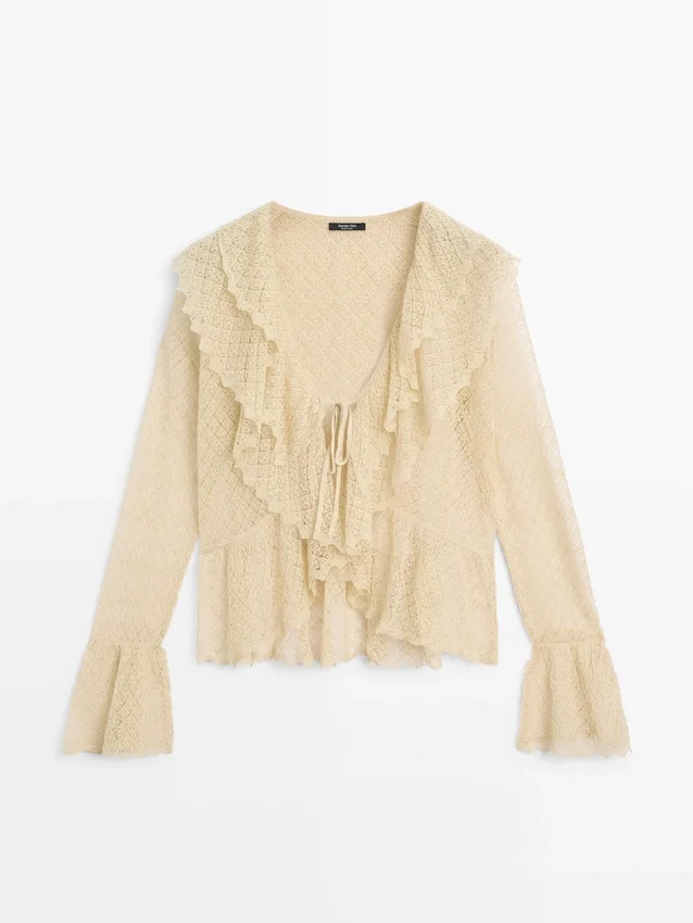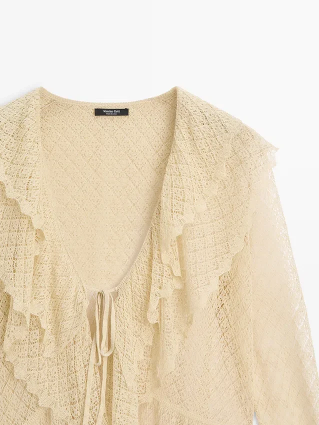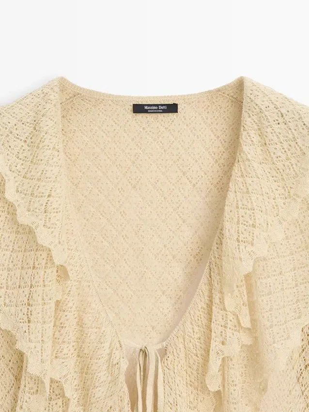 Cardigan realizzato in tessuto a maglia misto lino. Scollo a V. Maniche lunghe con volant. Chiusura con fiocco. Dettagli con volant.