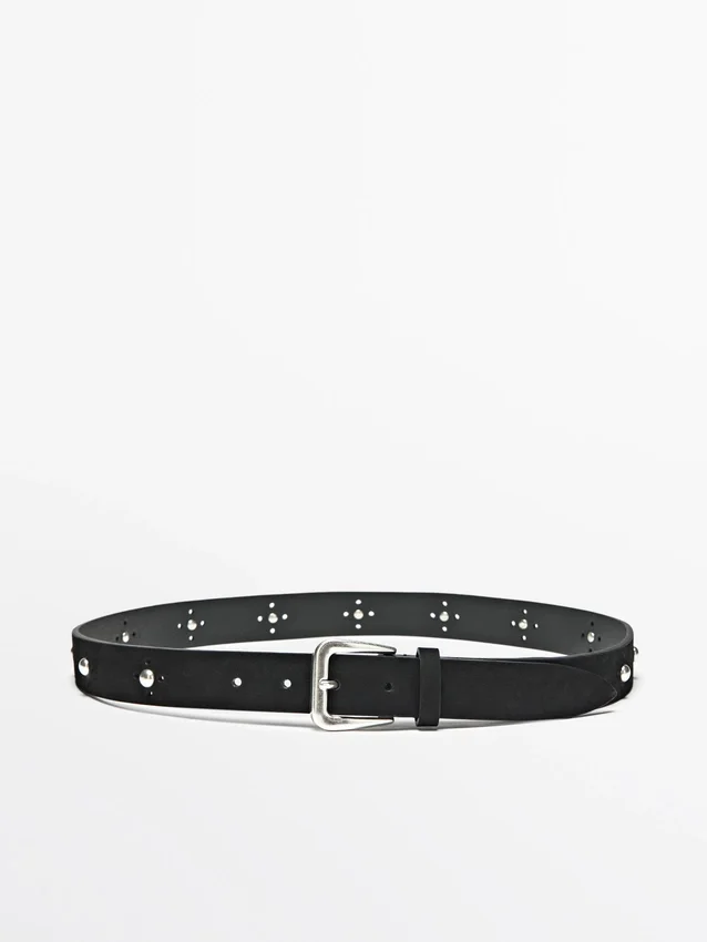 Cintura realizzata in pelle di vacchetta al 100%. Chiusura con fibbia in metallo e passanti in pelle. Dettagli con borchie.