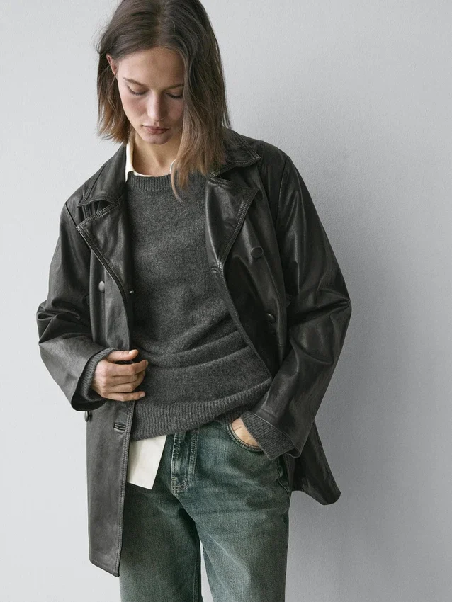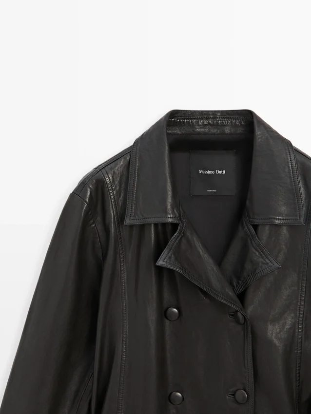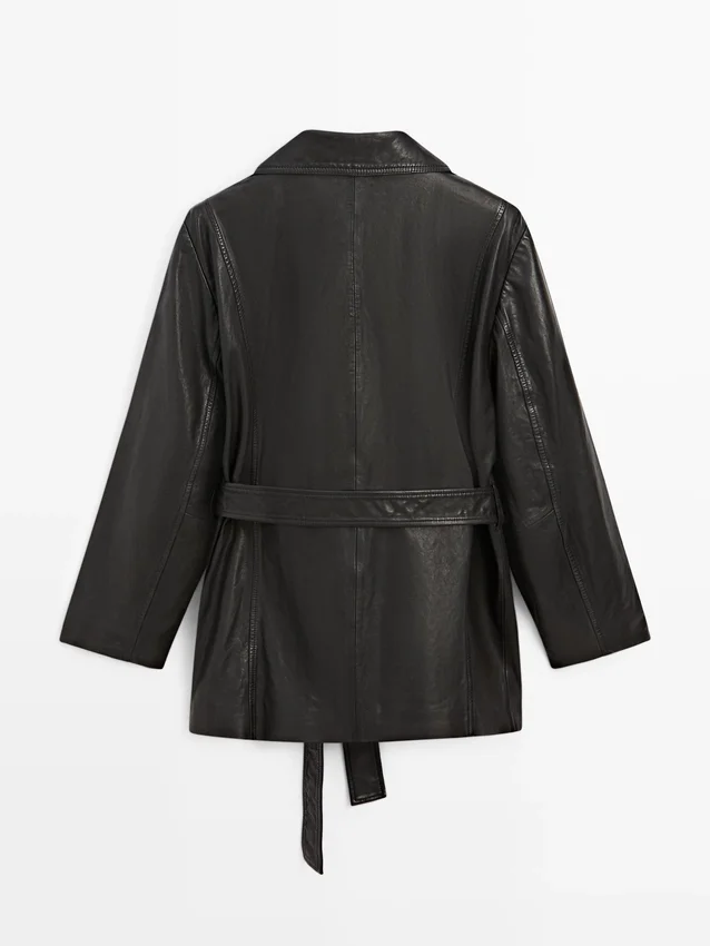 Giacca in pelle di montone con finitura nappa. Colletto con revers. Maniche lunghe. Chiusura frontale a doppio petto con bottoni. Dettagli cuciture. Include cintura.