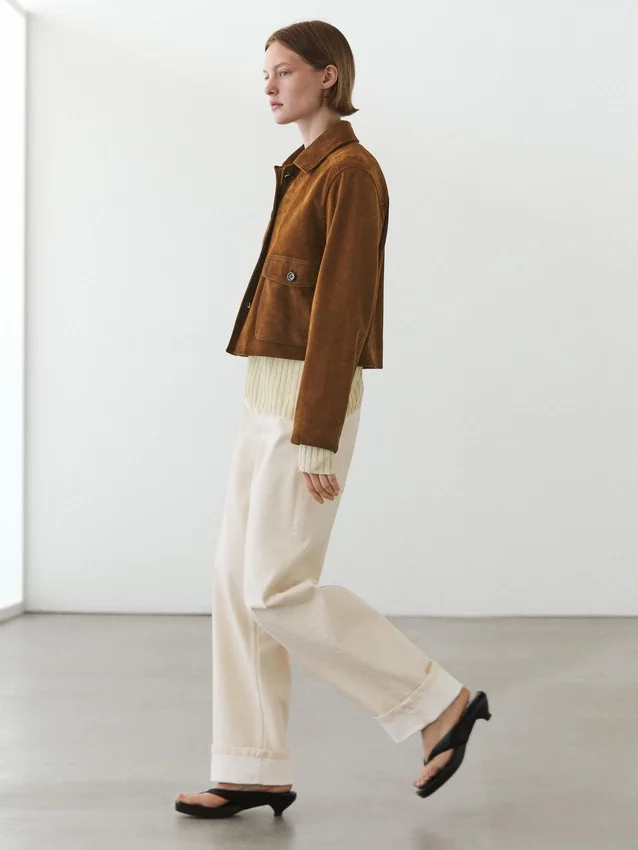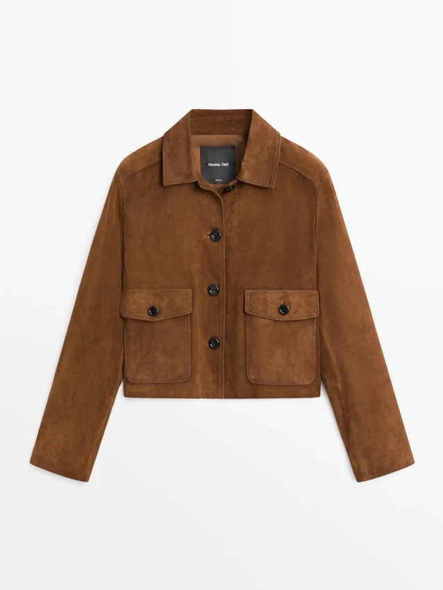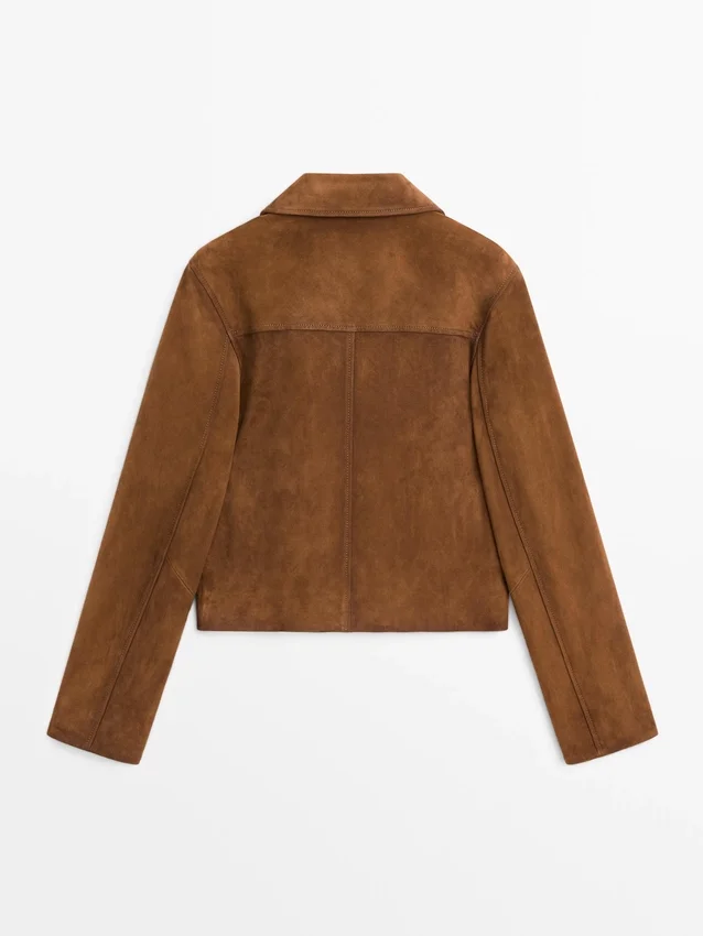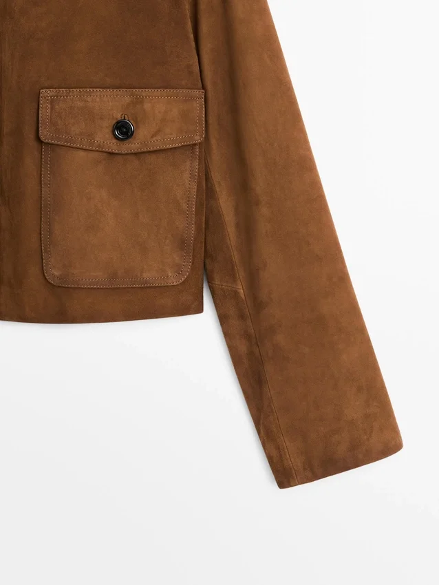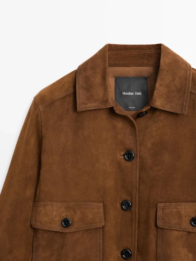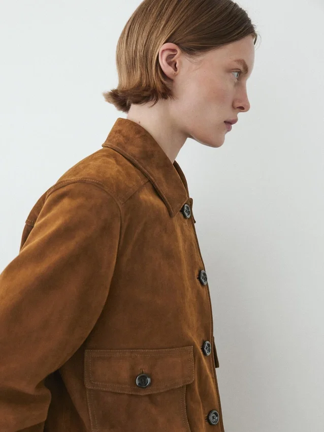 Giacca in pelle di capra con finitura scamosciata. Colletto a camicia. Chiusura frontale con bottoni. Due tasche applicate con patta abbottonata.