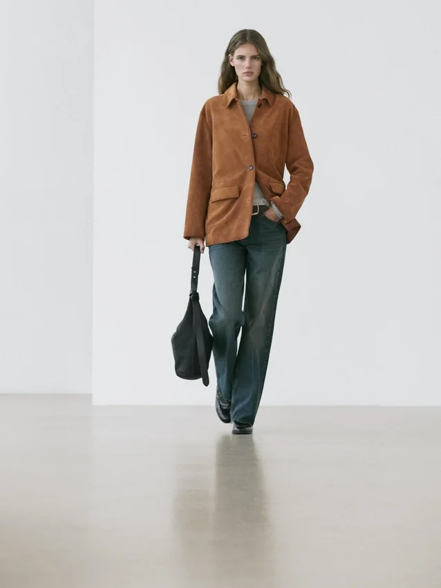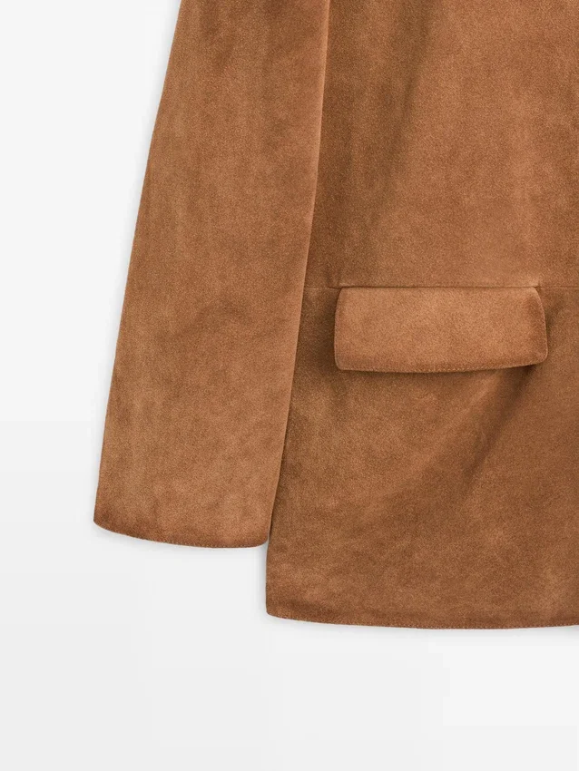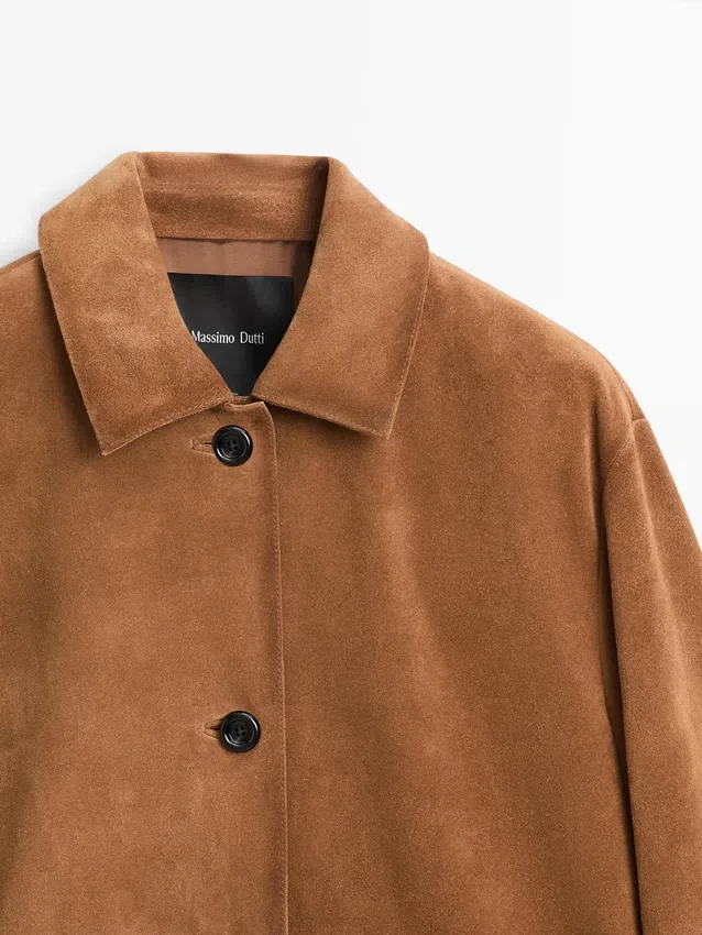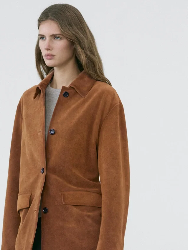 Giacca in pelle bovina con finitura scamosciata. Colletto a camicia. Maniche lunghe. Chiusura frontale con bottoni.
