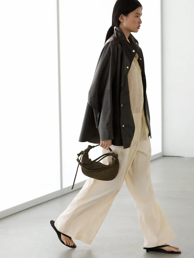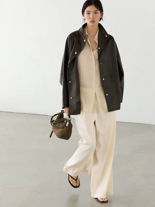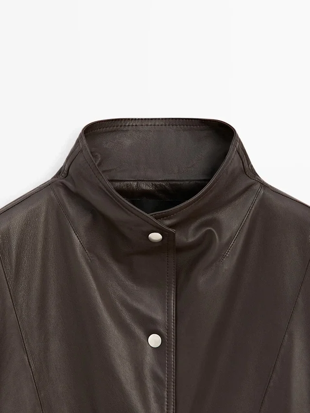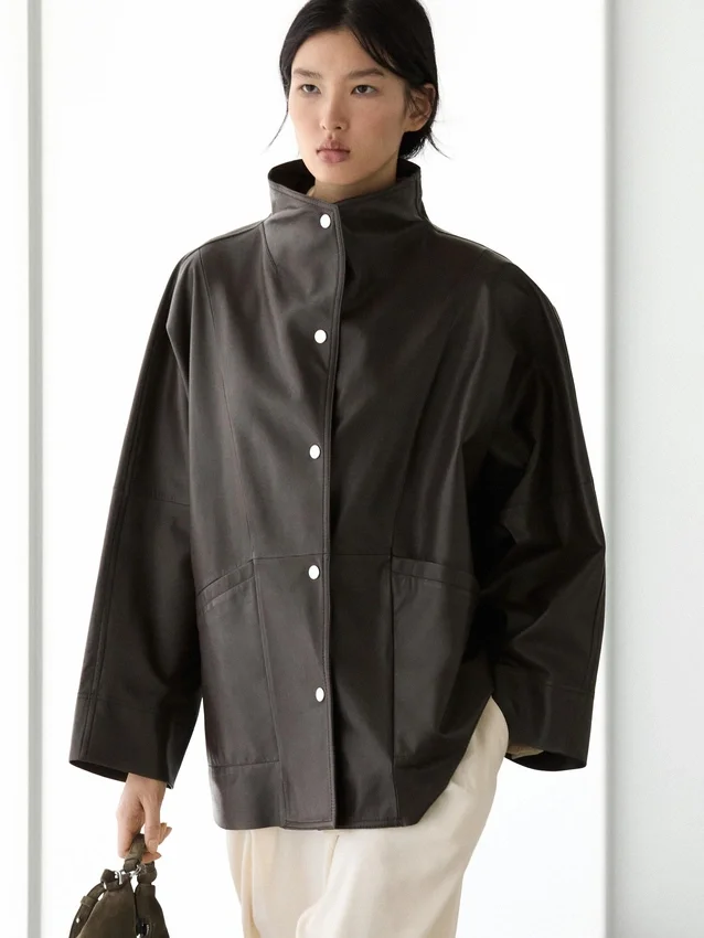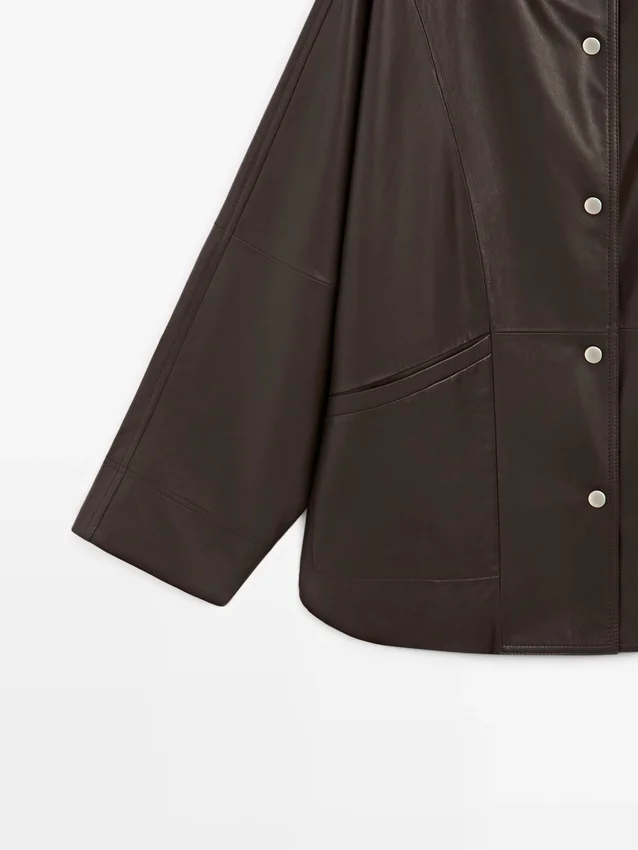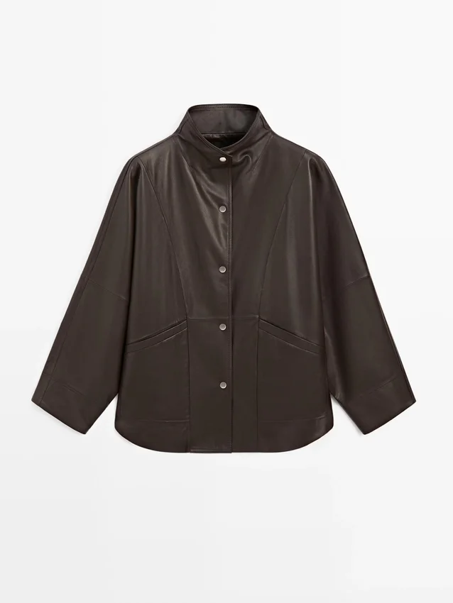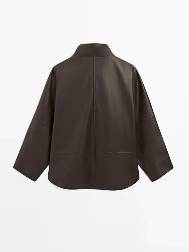 Cappa realizzata in pelle di montone con finitura in nappa. Maniche lunghe e larghe. Chiusura frontale con bottoni. Collo alto. Due tasche laterali. Dettagli cuciture.