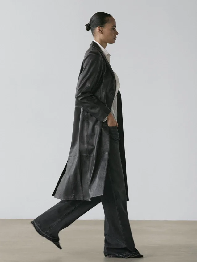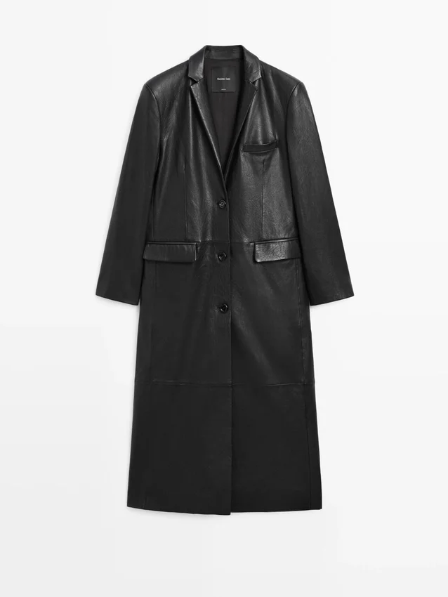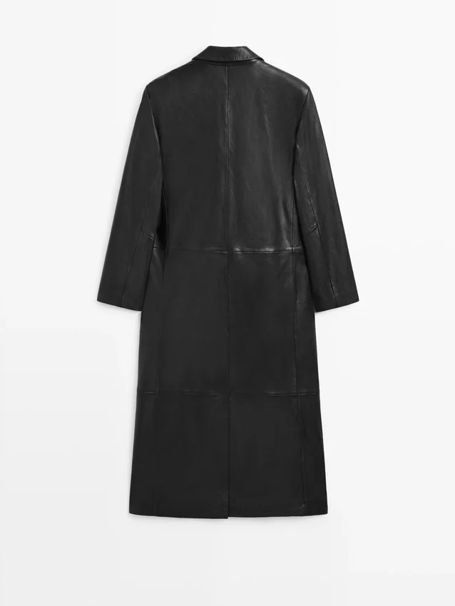 Cappotto lungo in pelle di montone con finitura nappa. Collo con revers. Chiusura frontale con bottoni. Due tasche con patta. Una tasca a filetto.Composizione