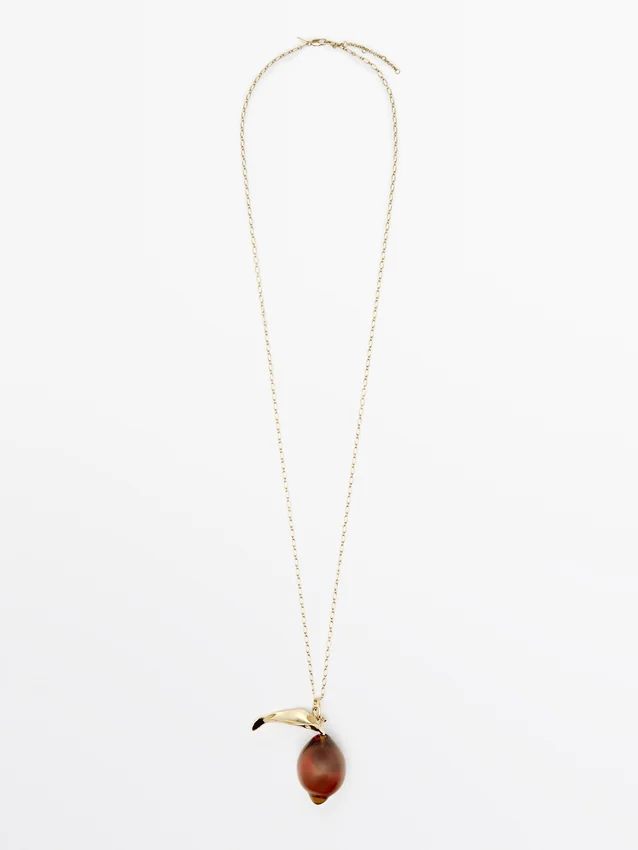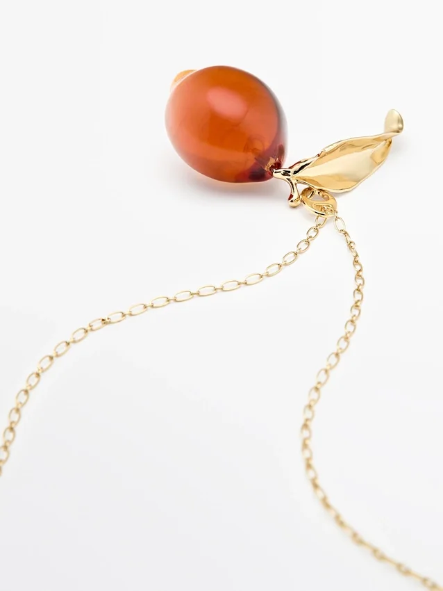 Collana a catena con pendente in vetro a goccia e dettaglio a foglia. Chiusura a moschettone.