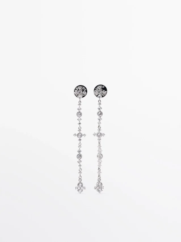 Orecchini pendenti luccicanti. Chiusura con bottone a pressione.