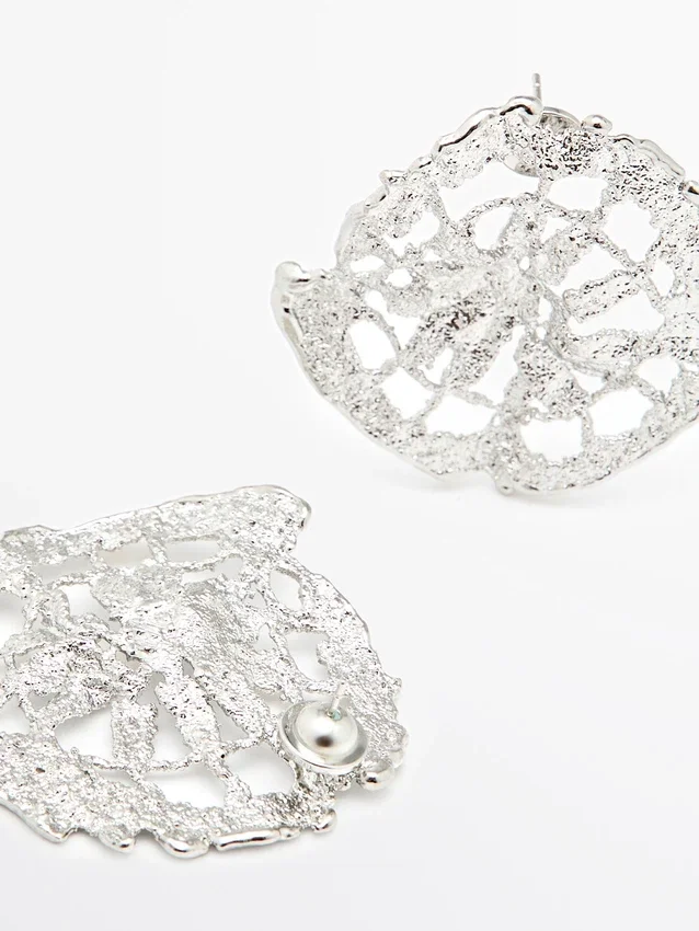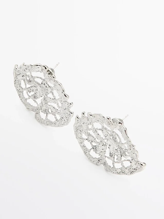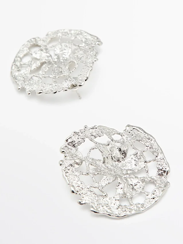 Orecchini in metallo testurizzato. Chiusura a bottone a pressione.