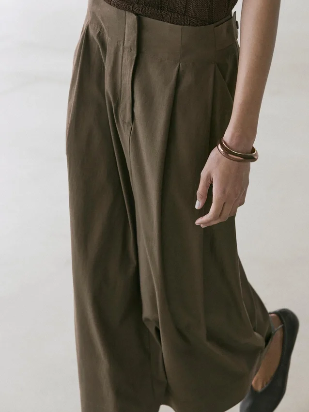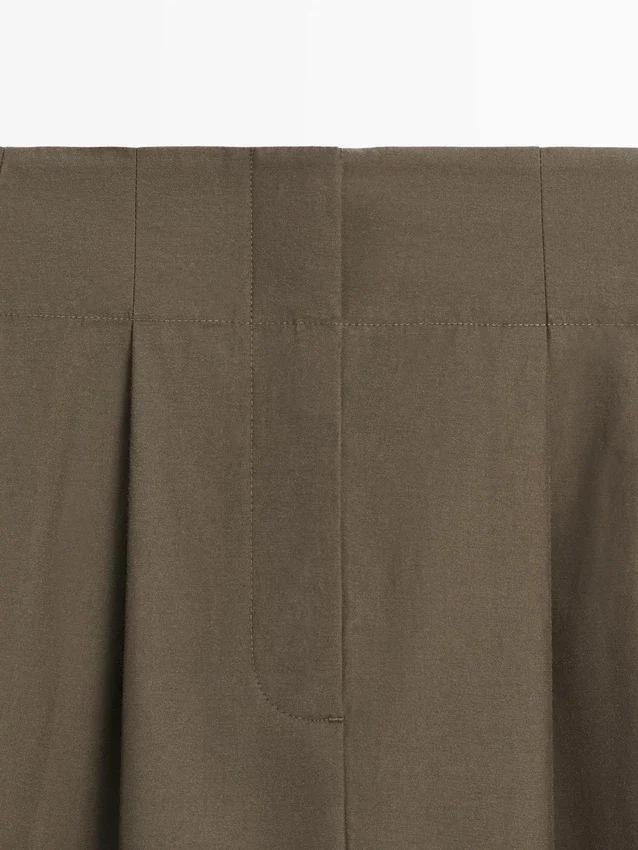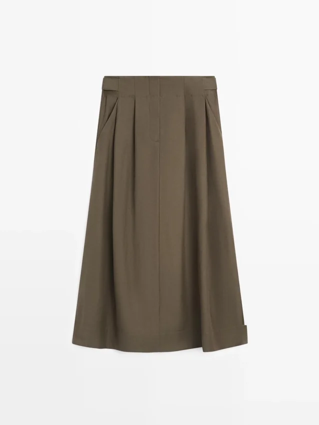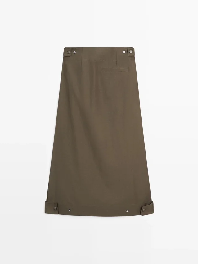 Gonna midi in misto cotone. Dettaglio a fascia in vita. Chiusura con cerniera nascosta da un’abbottonatura, con gancio e occhiello e bottone.