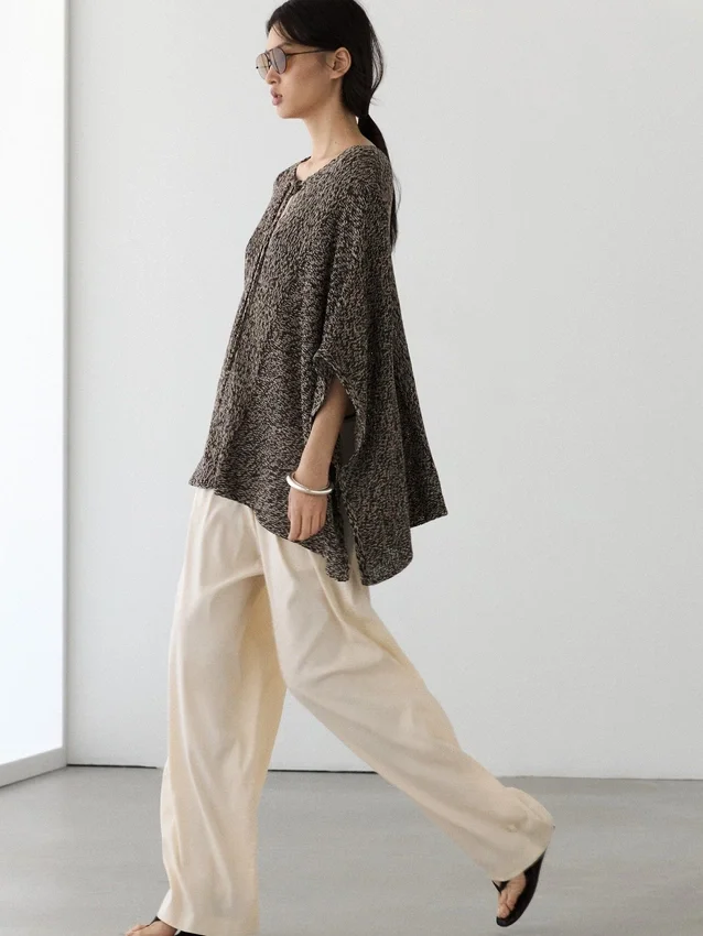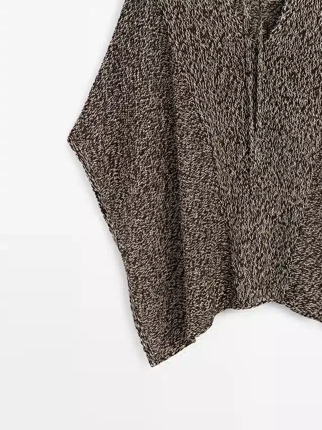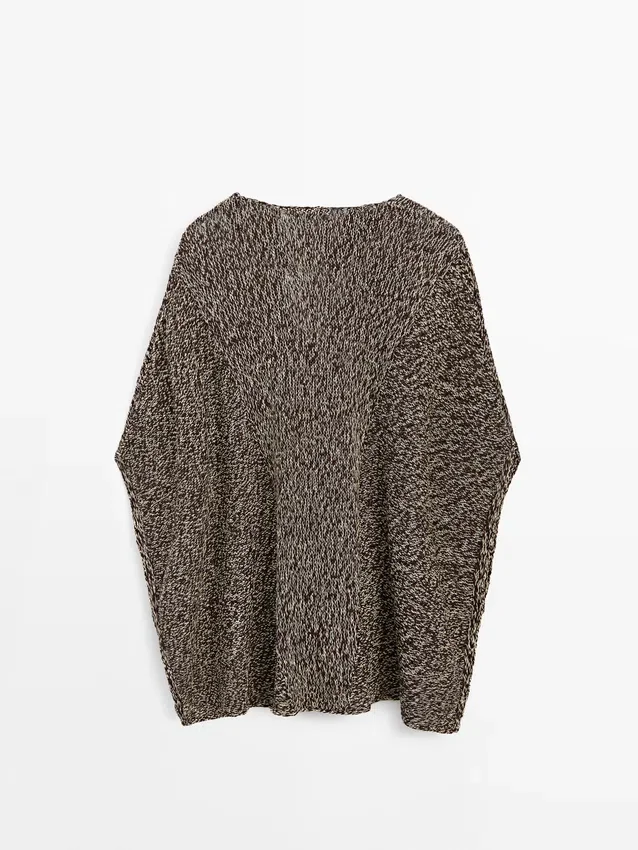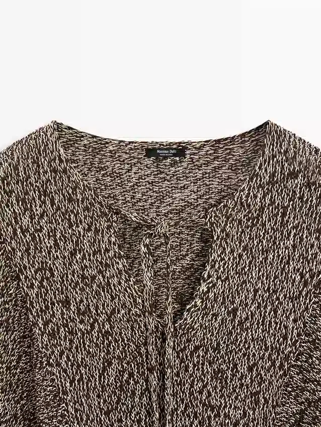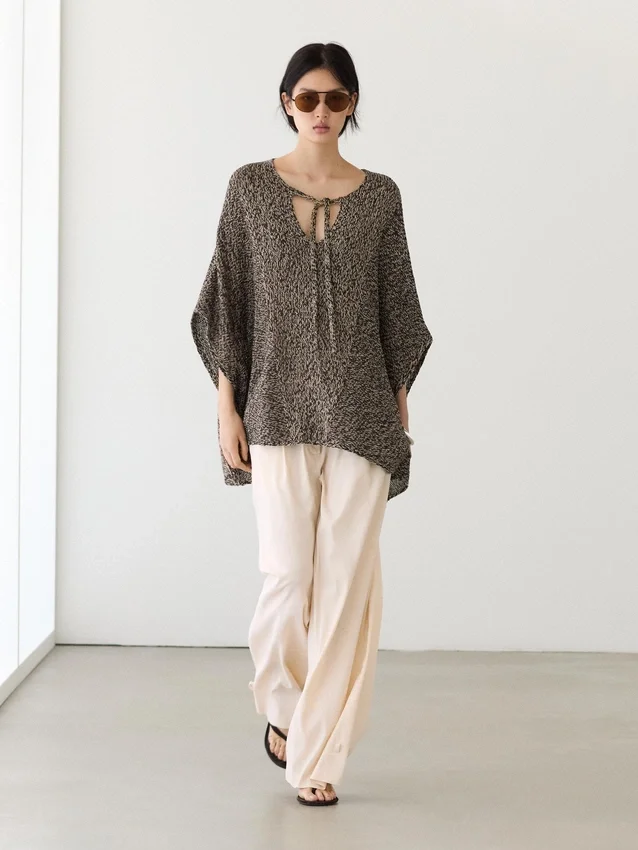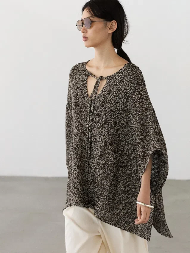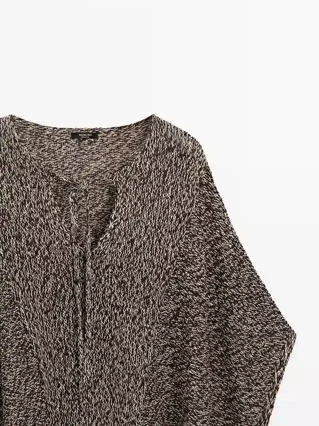 Cappa in maglia mista cotone. Scollo a V con dettaglio a laccio. Silhouette ampia e morbida, non sartoriale.