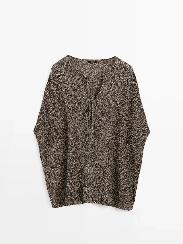 Cappa in maglia mista cotone. Scollo a V con dettaglio lacci. Silhouette ampia e morbida, non sartoriale.