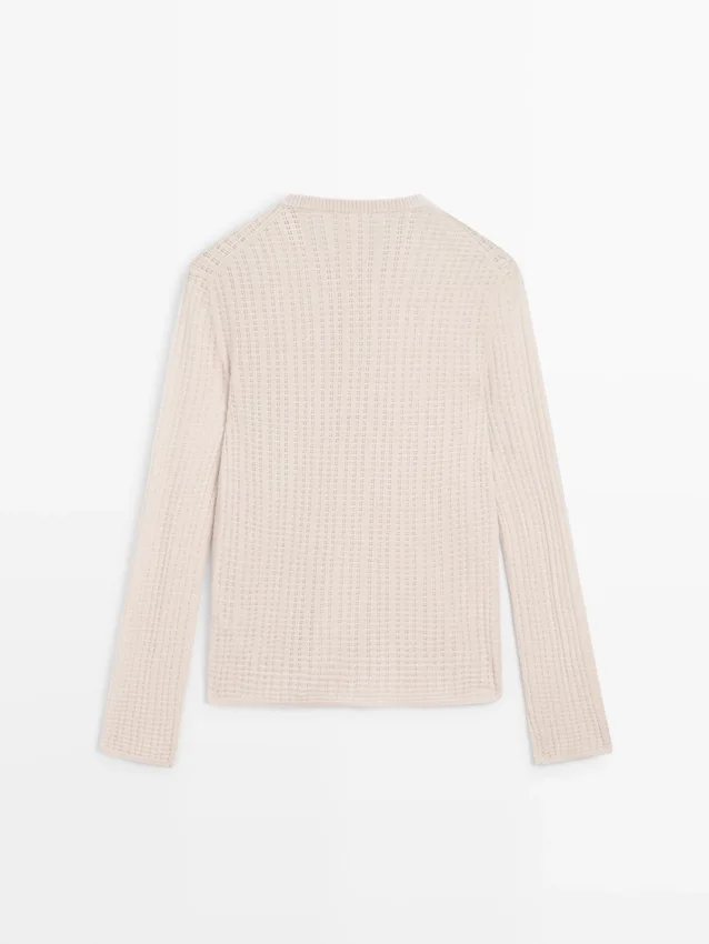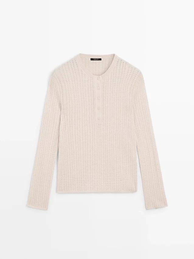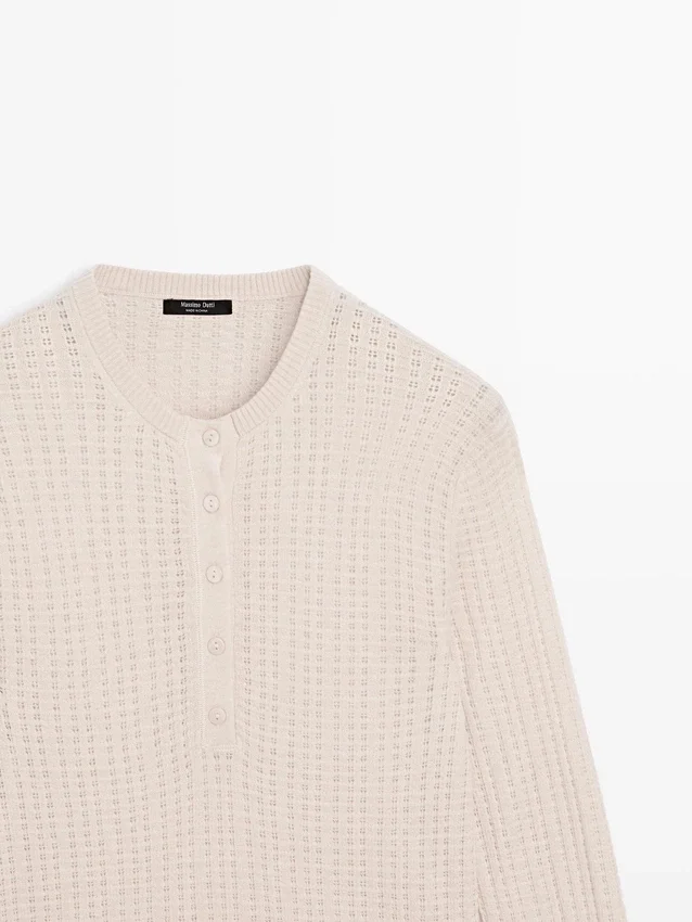 Maglione in maglia mista lana. Silhouette leggermente aderente, che conferisce un aspetto più definito e slanciato. Maniche lunghe. Round Buttoned Neck. Tessuto traforato.