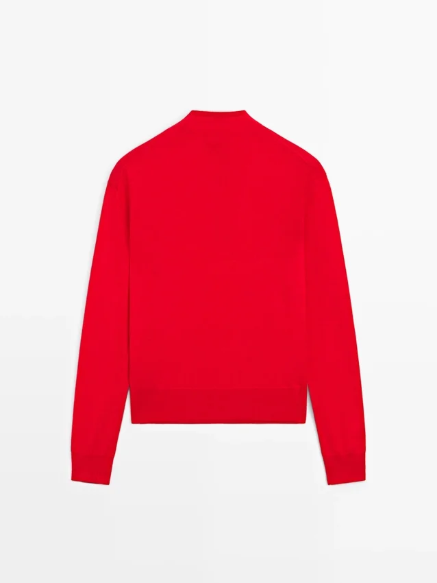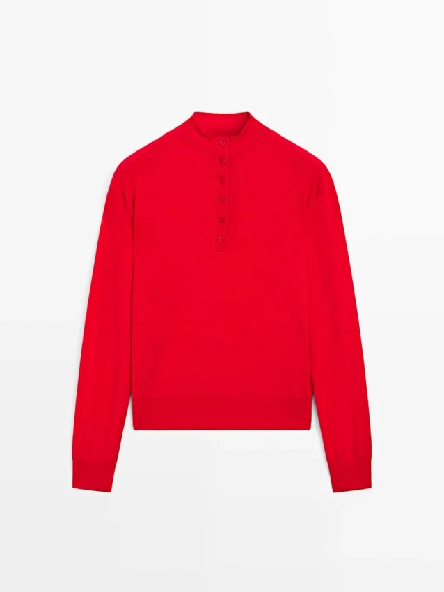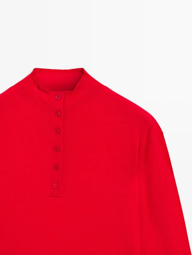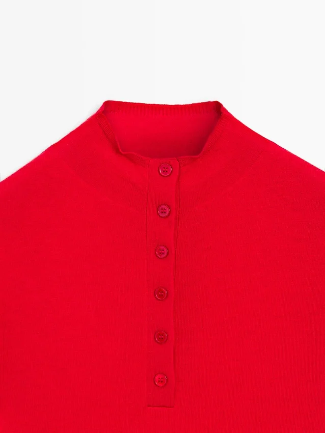 Maglione in maglia mista lana. Finto dolcevita. Maniche lunghe. Chiusura frontale con bottoni. Bordi a costine.