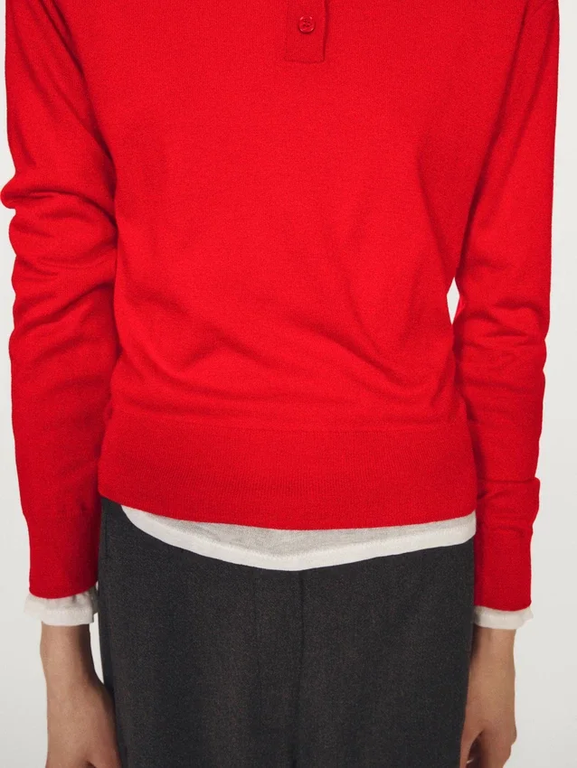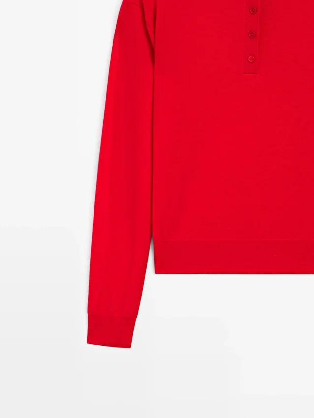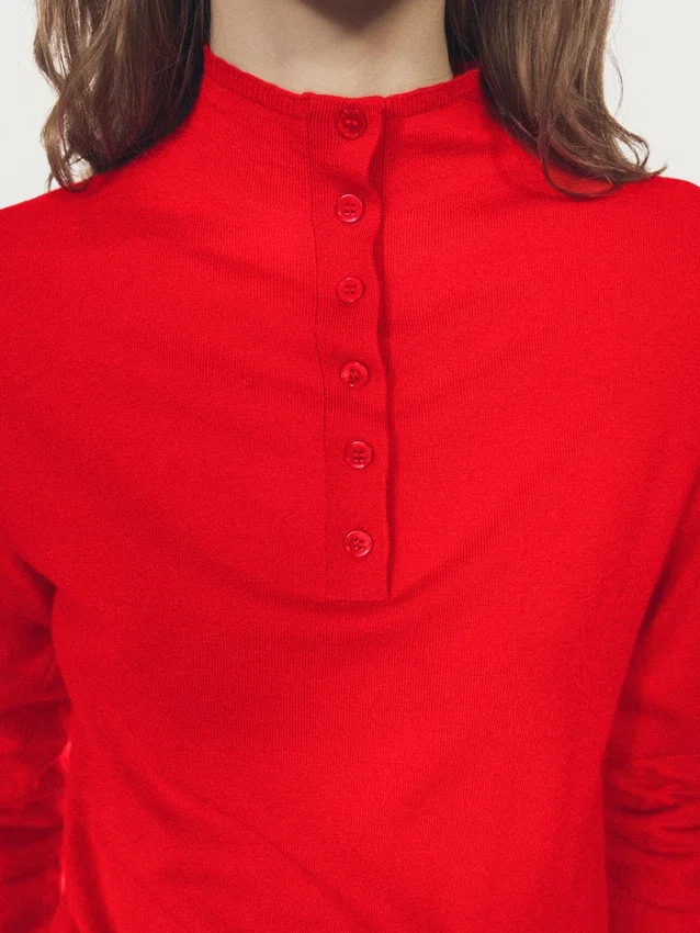 Maglione in maglia mista lana. Finto collo alto. Maniche lunghe. Chiusura frontale con bottoni. Bordi a costine.