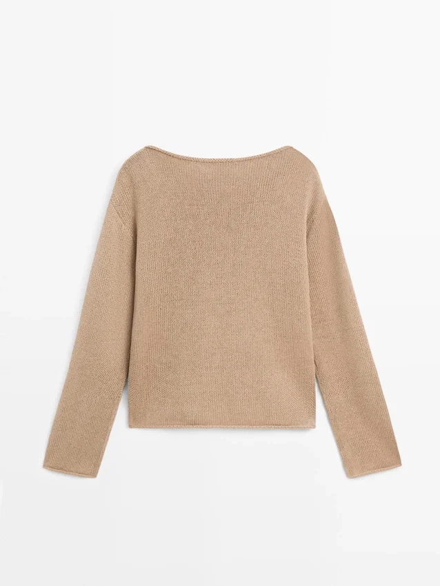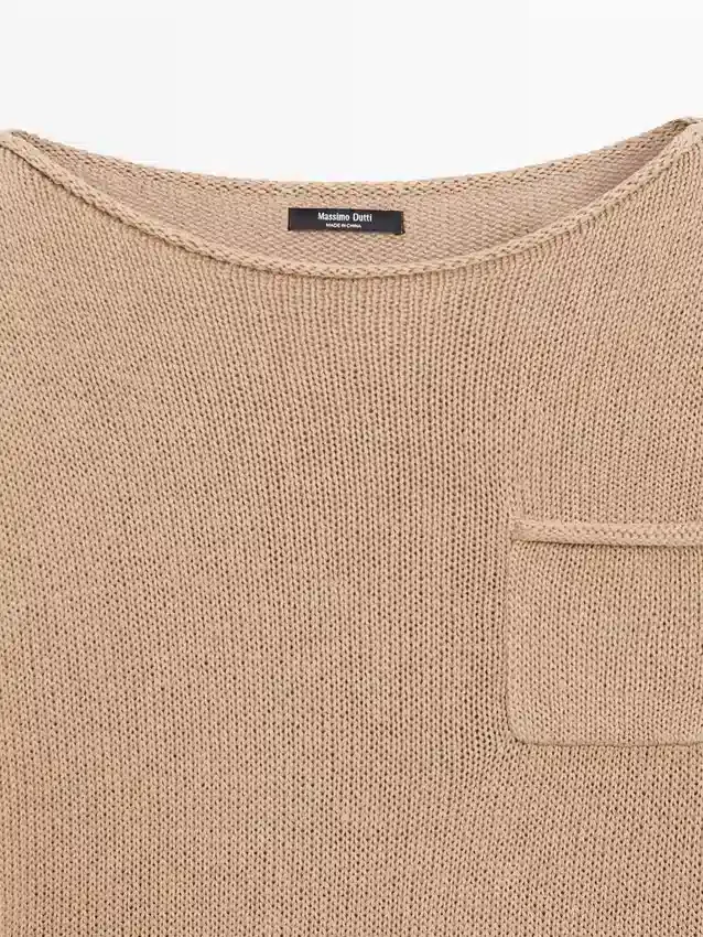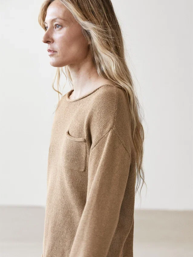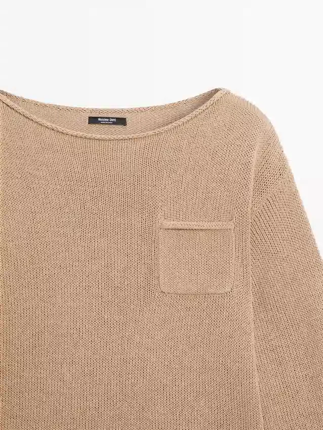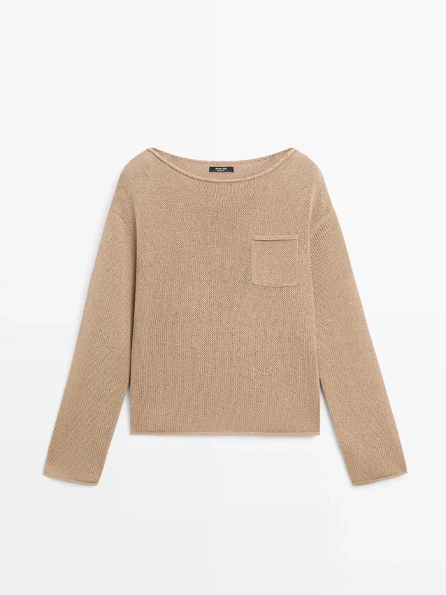 Maglione in tessuto di cotone e lino. Scollo a barchetta. Maniche lunghe. Tasca applicata sul petto.