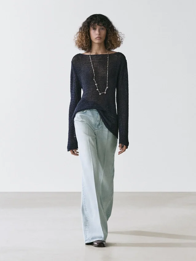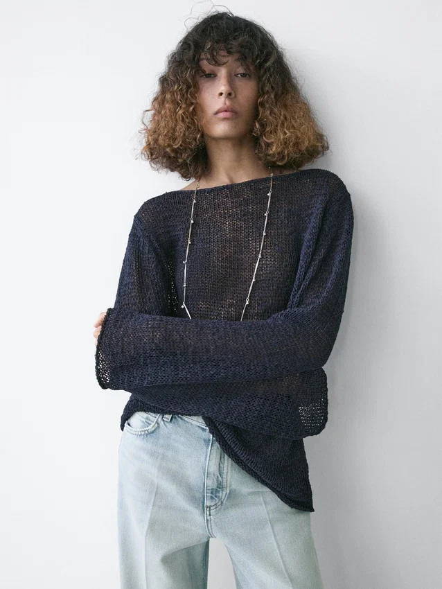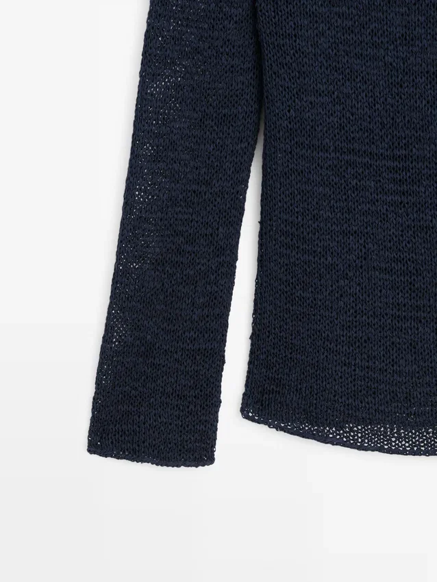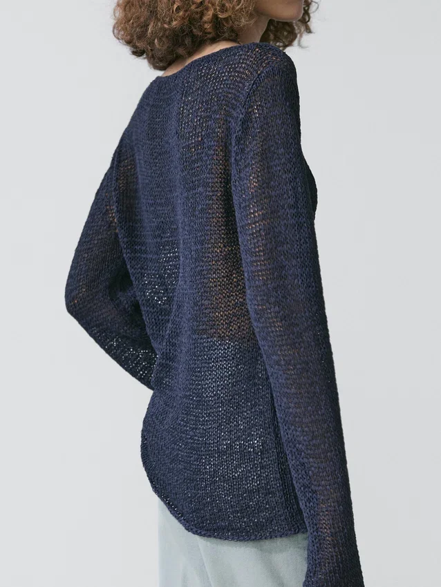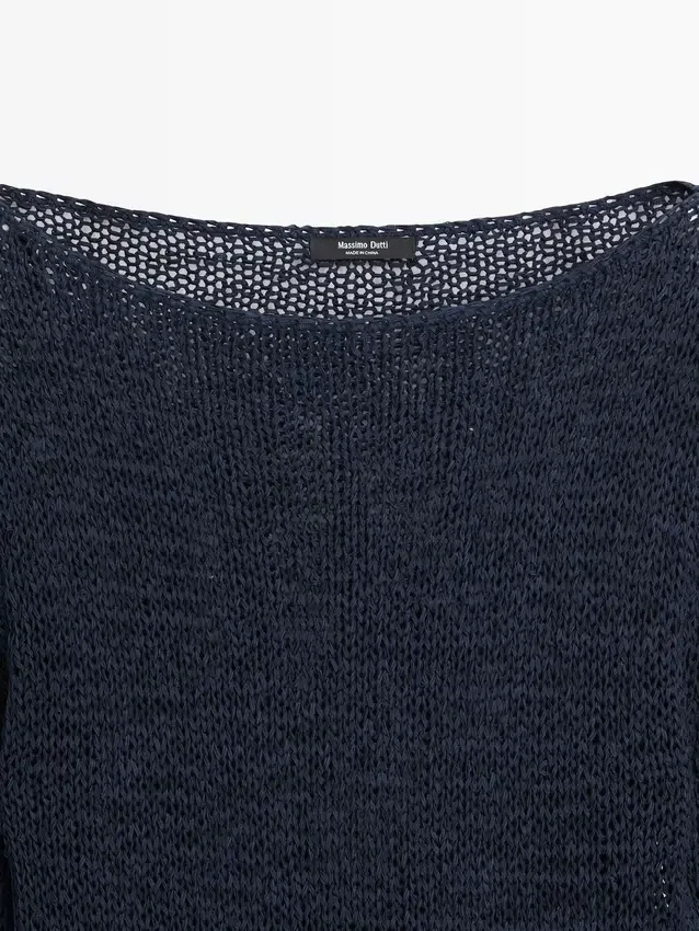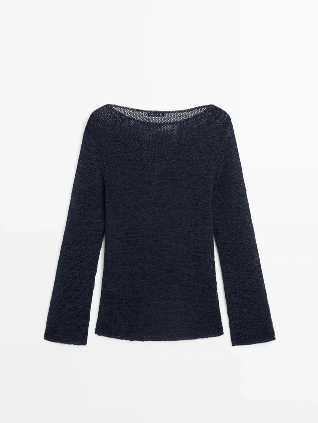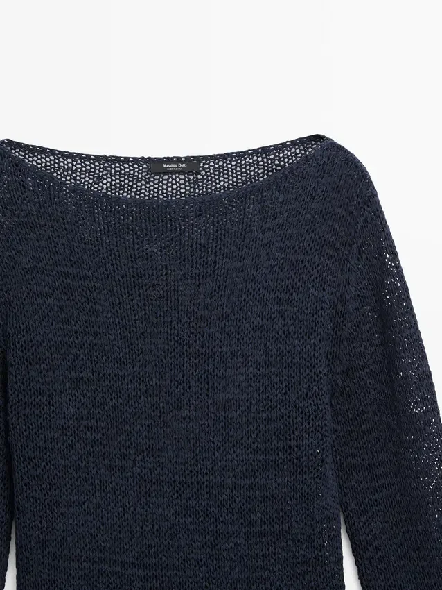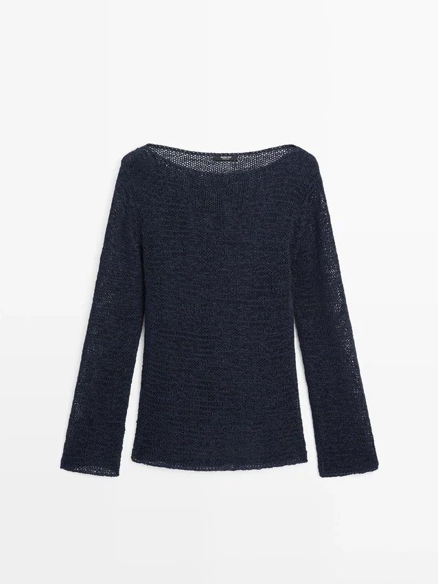 Maglione in maglia mista cotone. Scollo a barchetta. Maniche lunghe.