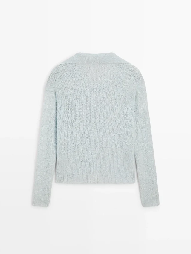 Maglione in maglia realizzato in misto alpaca. Collo alla Johnny. Maniche lunghe. Dettaglio spalle scese.Composizione