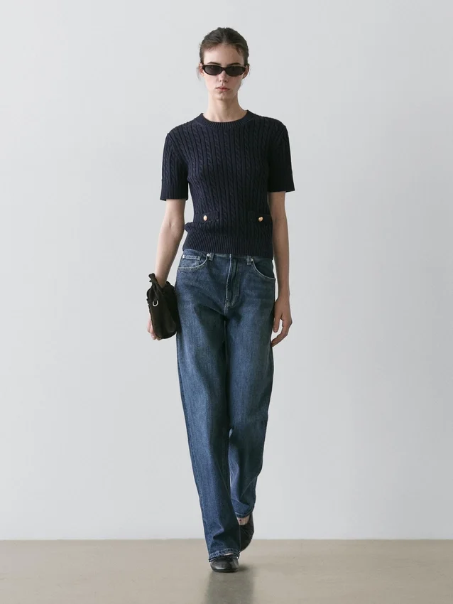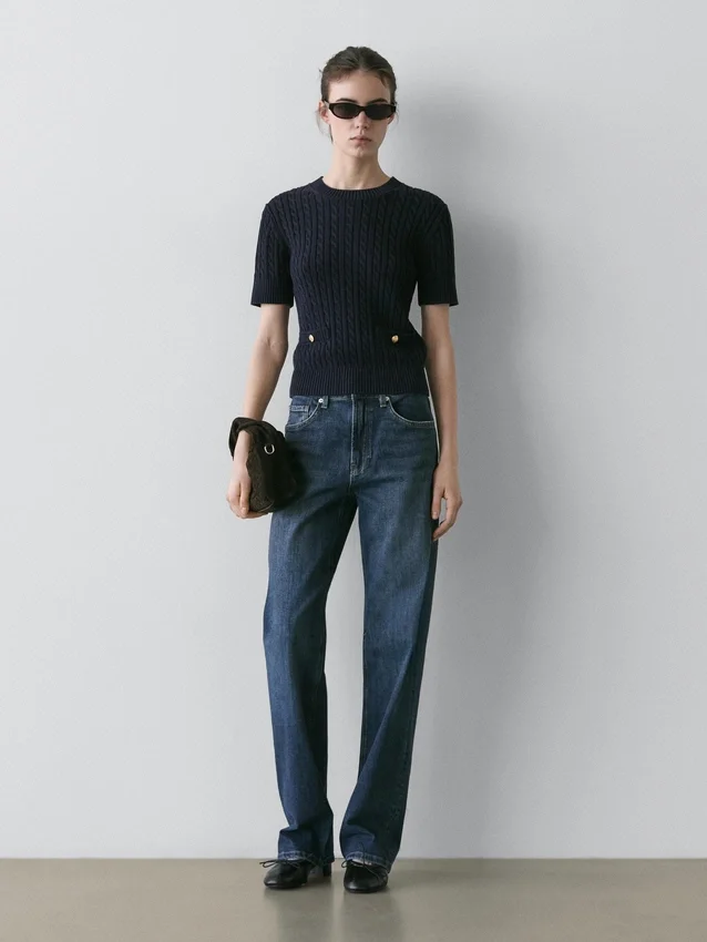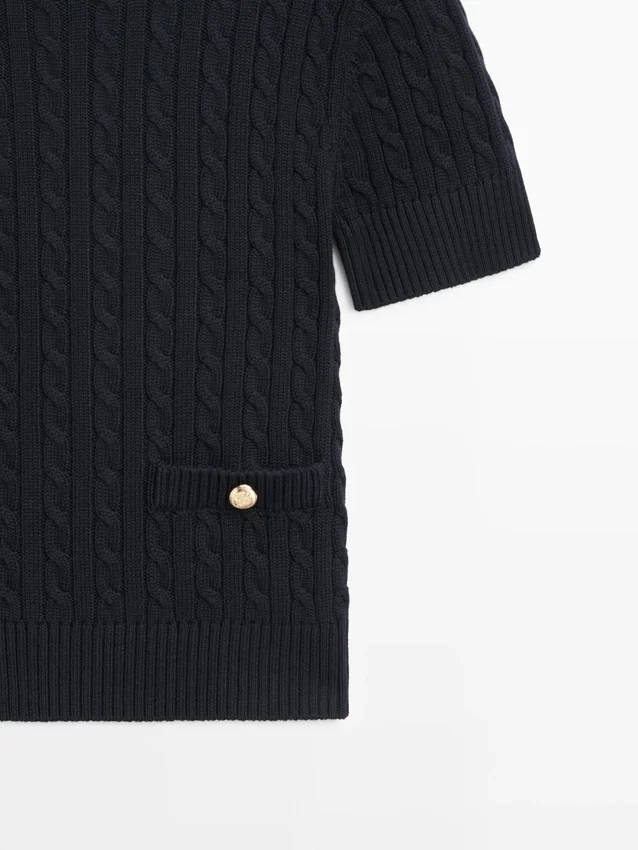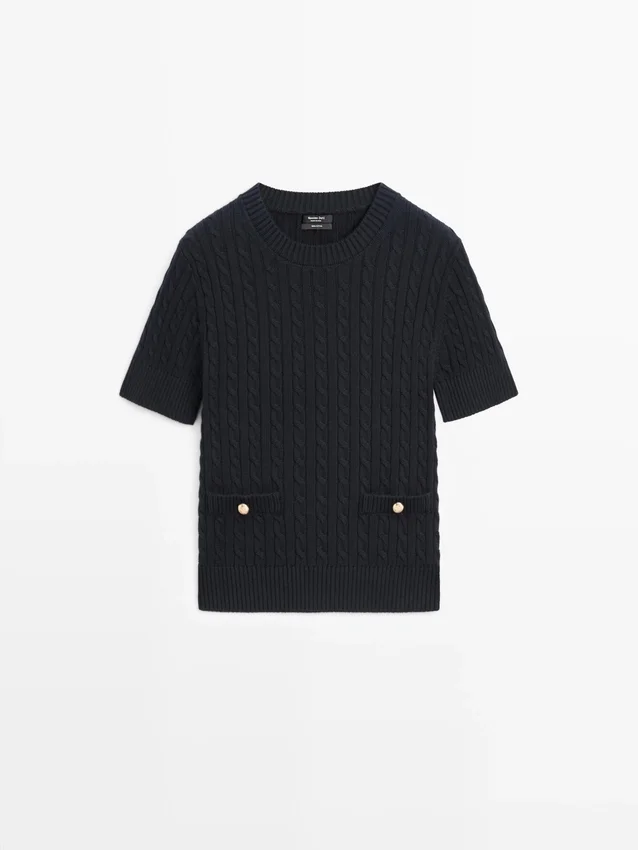 Maglione in maglia realizzato in tessuto di cotone. Girocollo. Maniche corte. Eleganti bottoni in strass color oro. Due tasche a filetto. Dettagli intrecciati.